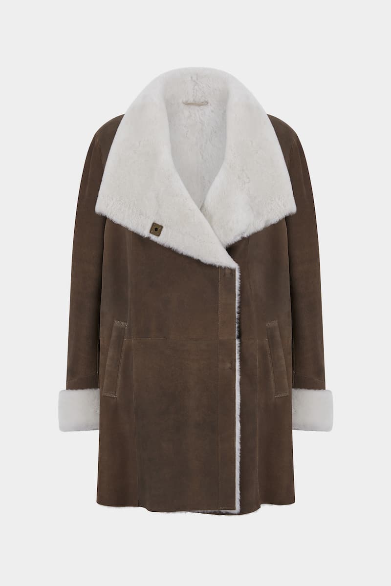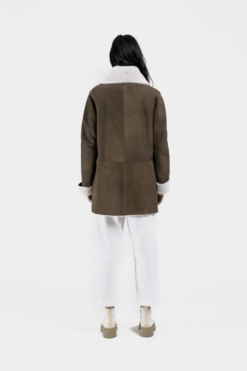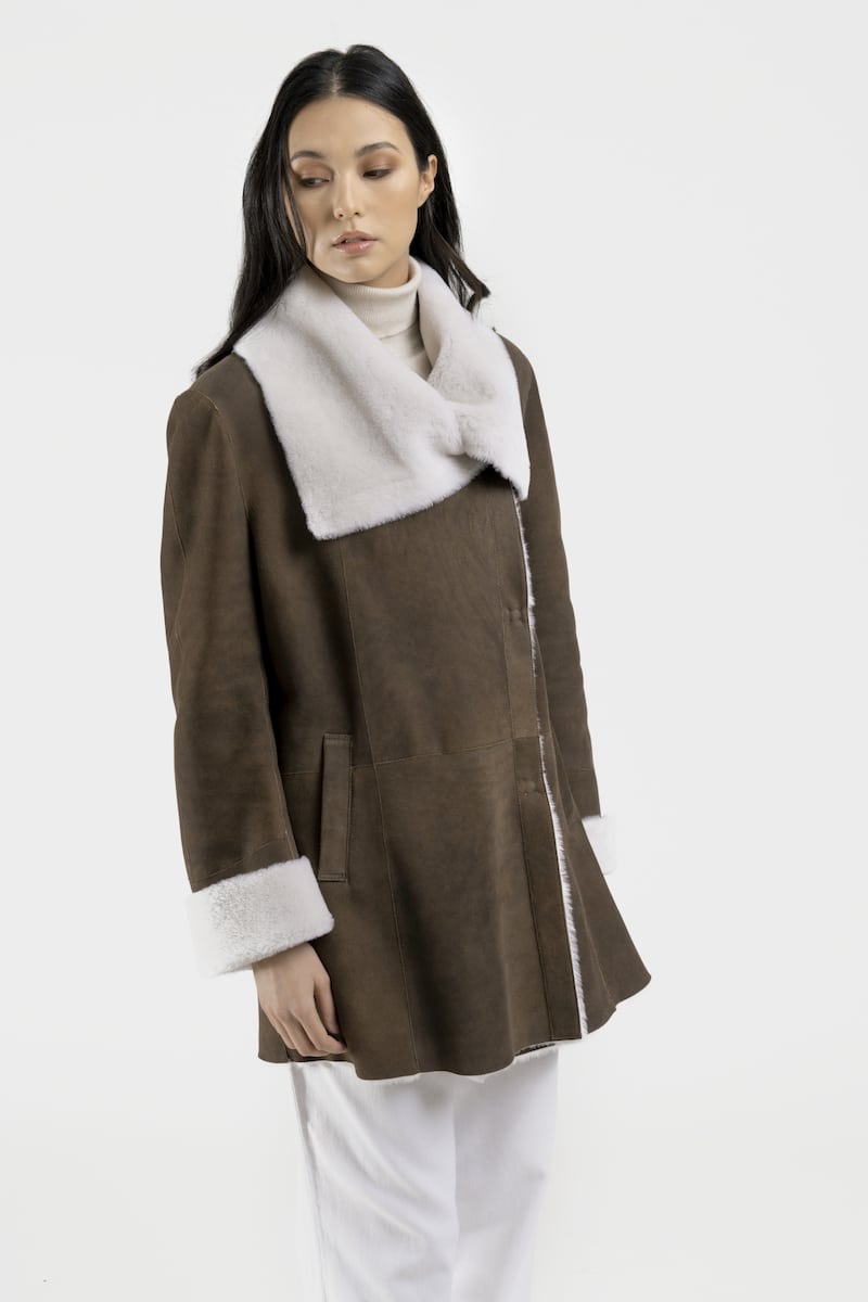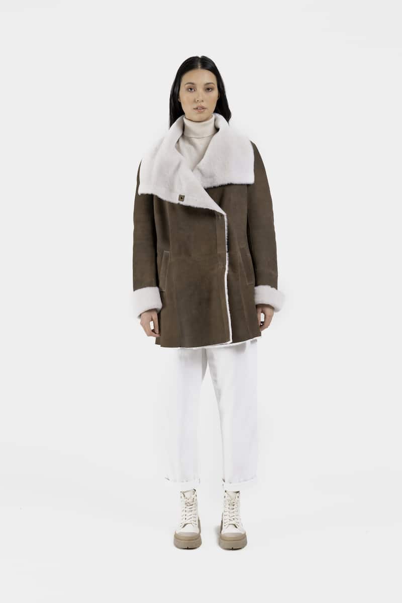 Cette veste ¾ droite avec grand col en agneau retourné mérinos laine blanche présente une fermeture par 3 pressions cousues main, 2 poches latérales à large passepoil et des petites pressions sous le col. Longueur veste : 79 cm.