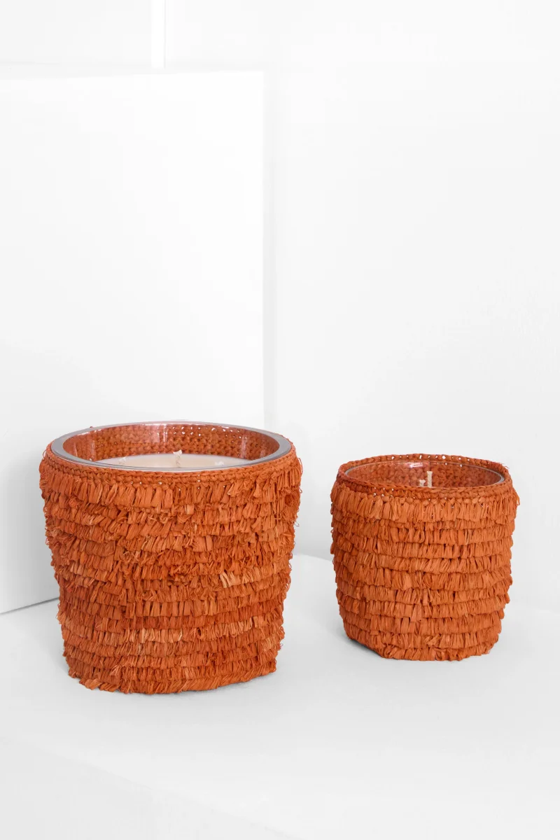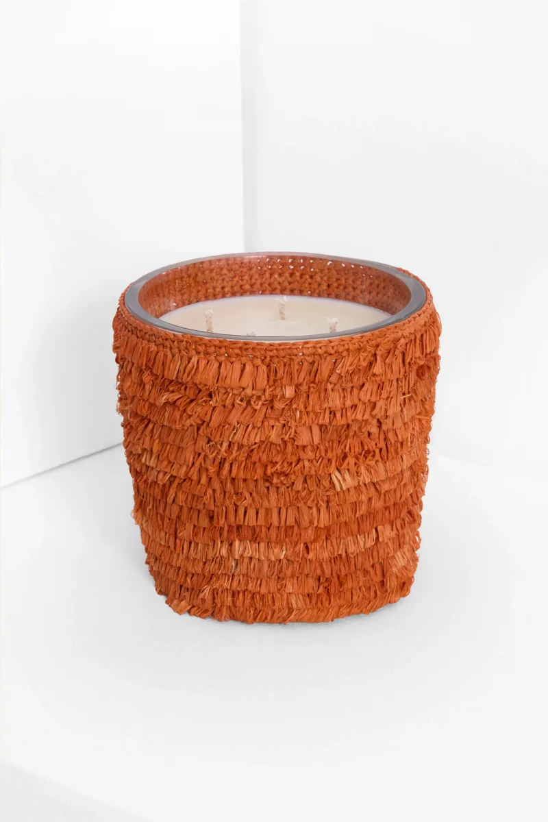 - Caractéristiques : raphia naturel crocheté. Cire 100% végétale parfumée aux essences précieuses de Grasse. Mèche en coton bio.