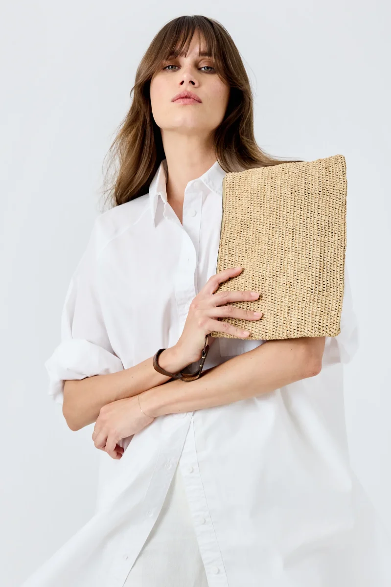 - Matières : 100% en Raphia naturel, cette pochette doublée en coton bio allie souplesse et solidité d’une matière naturelle et durable. La dragonne est en cuir de zébu tanné selon un procédé végétal.