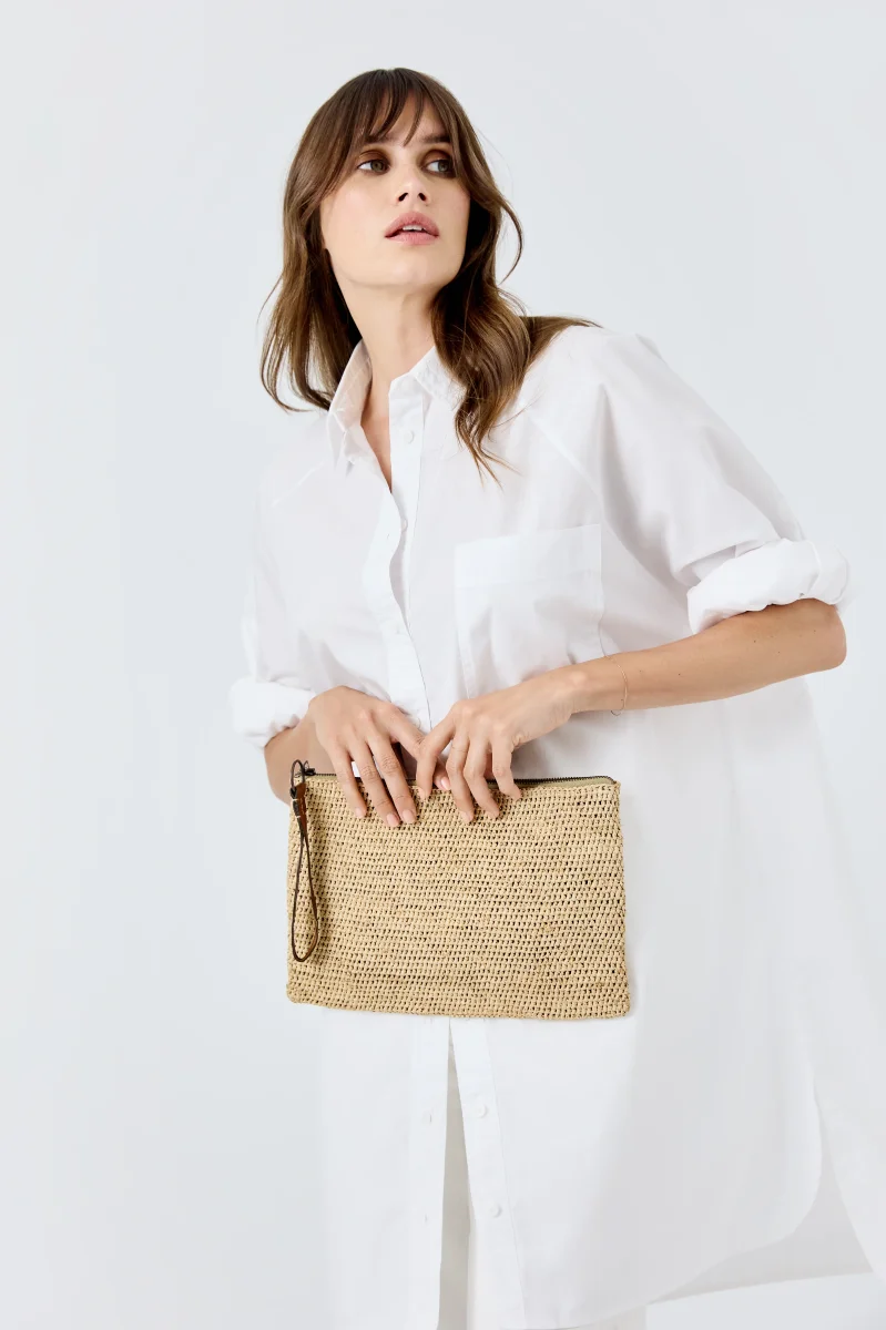 • Dimensions : De taille parfaite (30 cm long x 22 cm haut), la pochette en raphia AMPY contient l’essentiel sans vous encombrer.