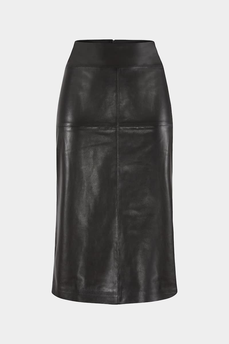Cette jupe en cuir d’agneau plongé noir présente une coupe droite cintrée à la taille, une fente et une fermeture éclair invisible dans le dos. Mi-longue et taille haute, Anna révèle des lignes féminines et se veut être la pièce intemporelle éclectique de votre garde-robe mi- saison.