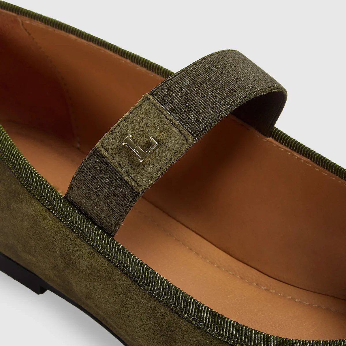 Silhouette ballerine classique Détail plissé sur l’avant Nœud décoratif Biais en gros-grain Logo Lounge doré à chaud sur la doublure Bracelet élastiqué avec médaillon métallique « L » Logo Lounge gravé sur la semelle Empeigne 100 % en daim Intérieur 100 % cuir Semelle en tunit ultra-souple premium Texture antidérapante