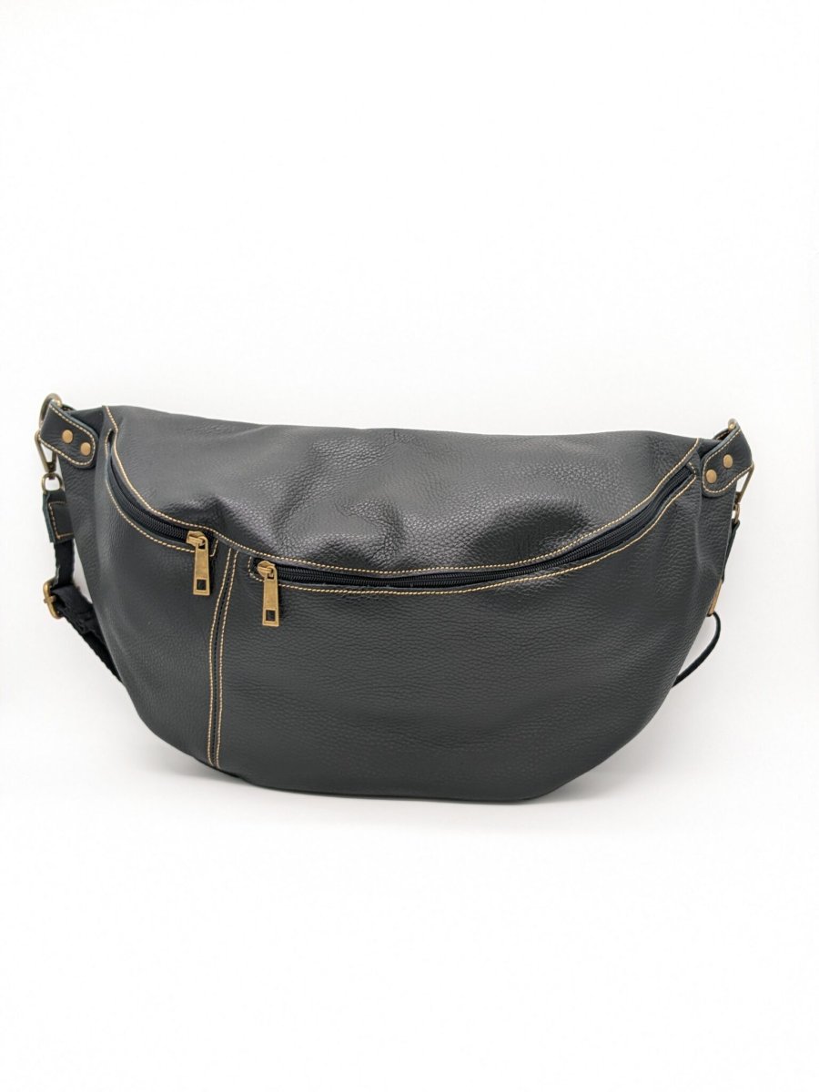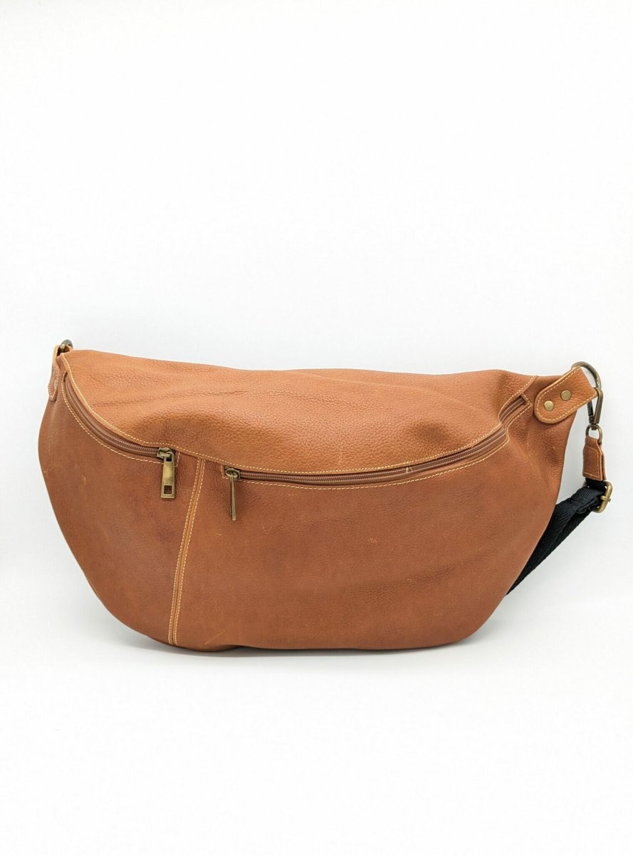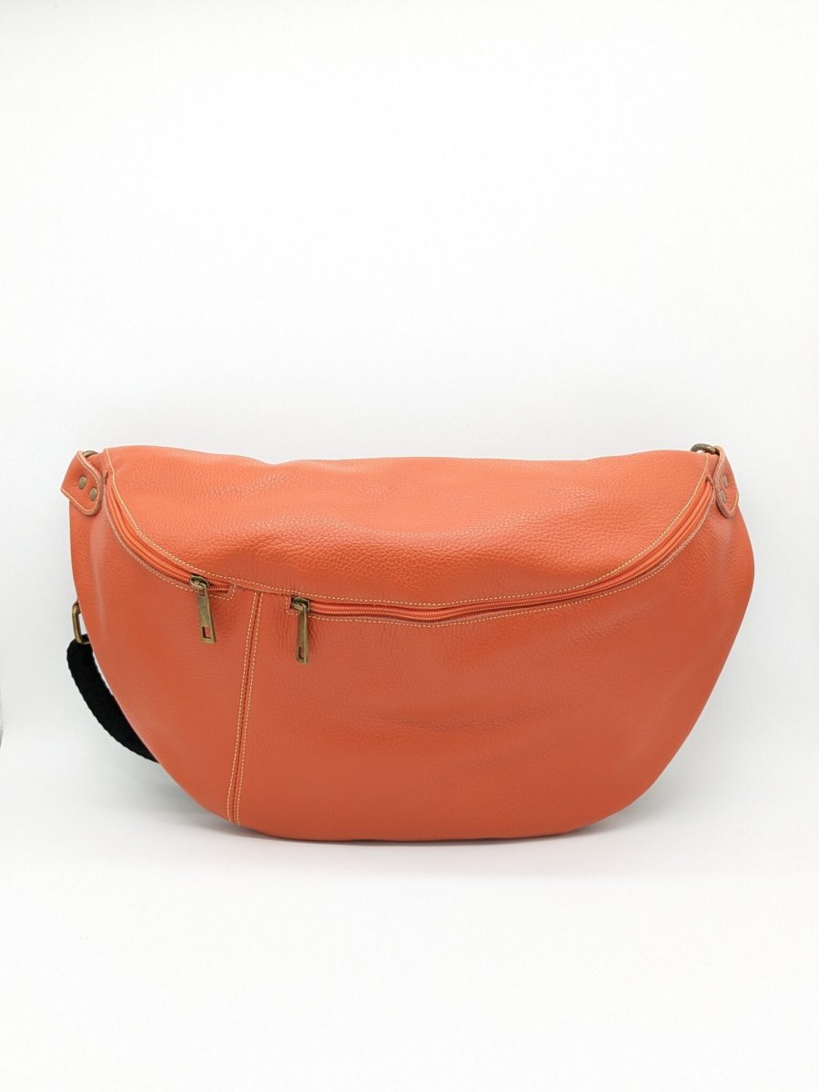 Gardez la Banane XXL ! – Sac bandoulière en cuir grainé de vachette – Bandoulière réglable – Une grande et une petite poche sur le devant – Poche zippée derrière le sac – Doublure tissu Dimensions (en cm) : 40 x 25 x 15 Fabrication artisanale Délai de livraison environ 10 jours