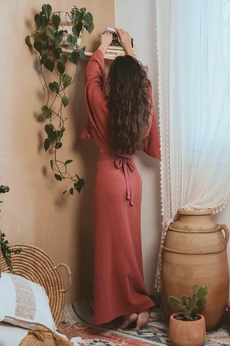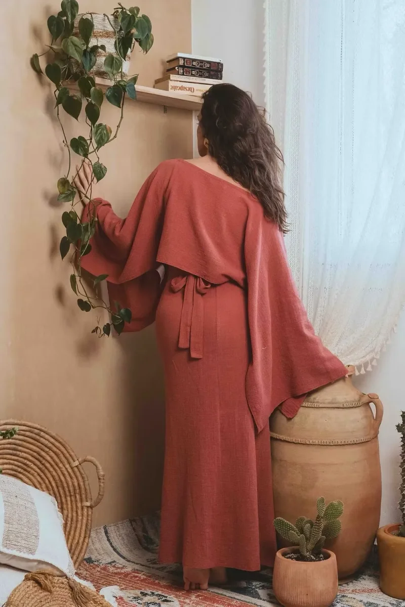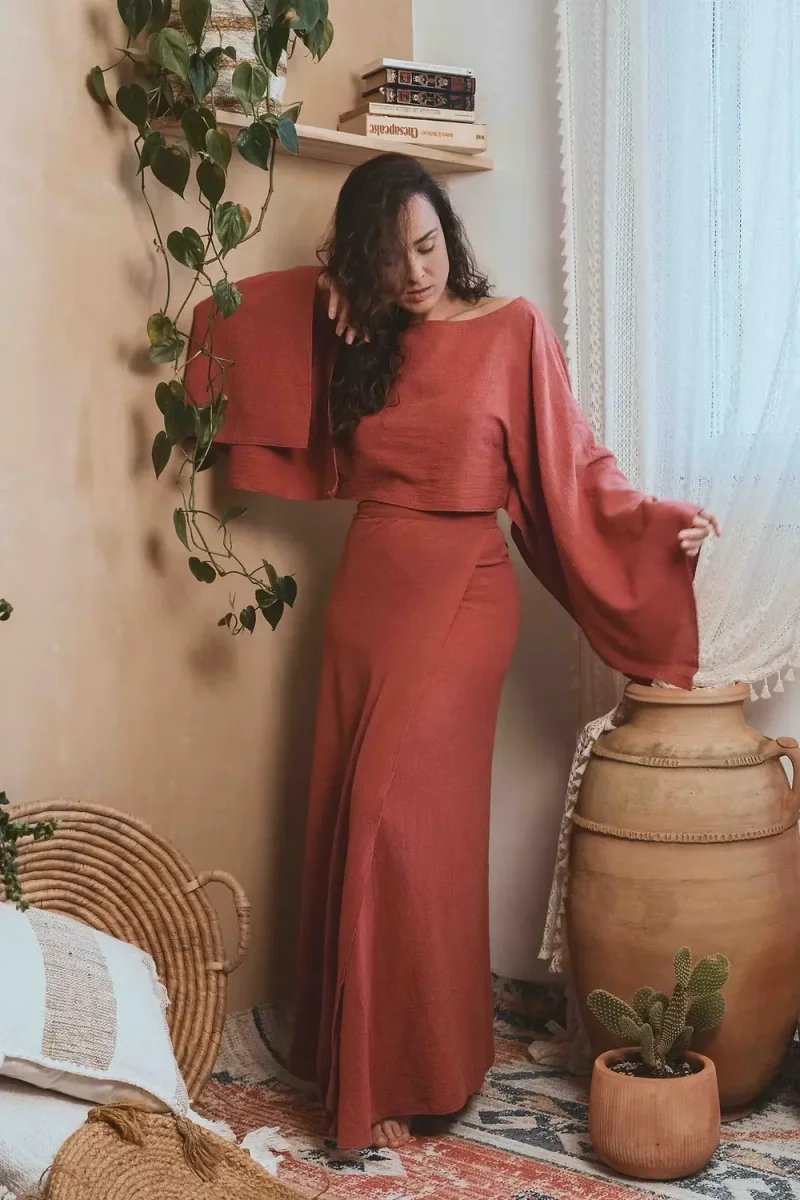 Élégante et aérienne, la blouse Alula – Terracotta séduit par son large col drapé, qui glisse délicatement sur l’épaule pour un effet naturellement sophistiqué. Ses manches amples apportent une touche de grâce et de fluidité, sublimant chaque mouvement.