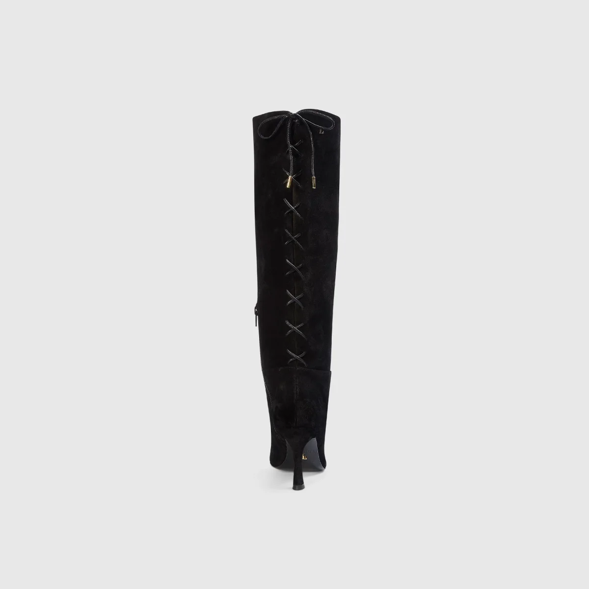 Confection entièrement en daim Forme fine avec bout pointu féminin Détail de laçage au dos, inspiré du corset, avec lacets en cuir et embouts dorés fins Fente d’ouverture au dos Talon fuselé recouvert de daim Épingle métallique « L » sur le dessus Col en daim noir avec doublure textile Logo doré imprimé à chaud […]