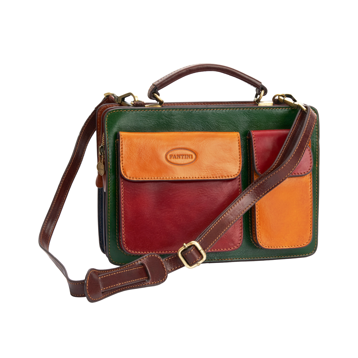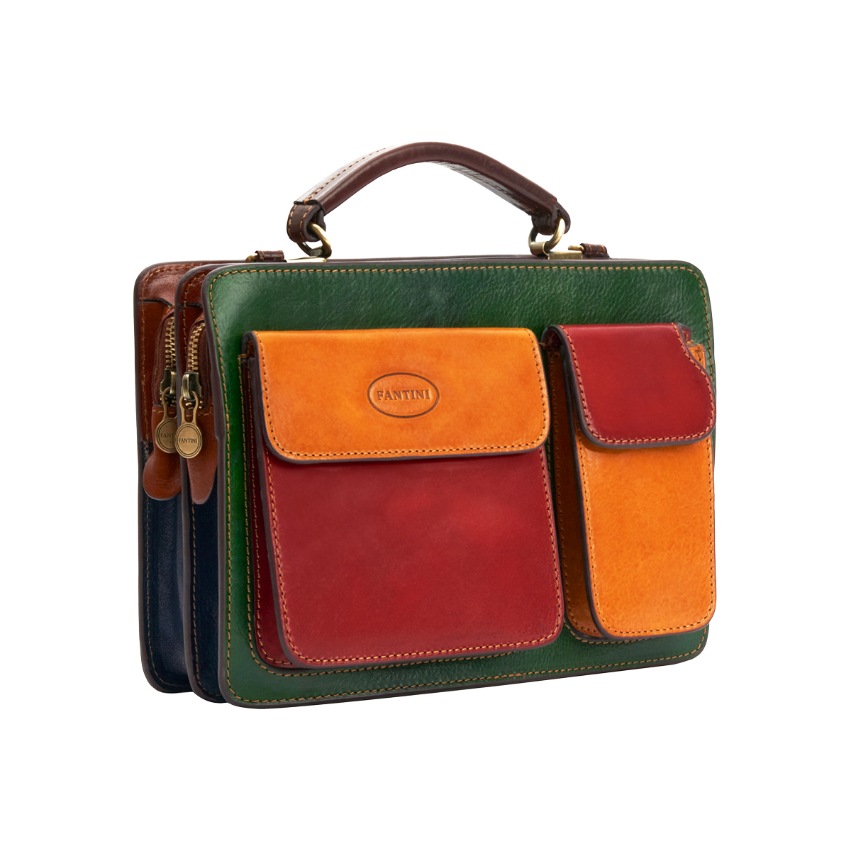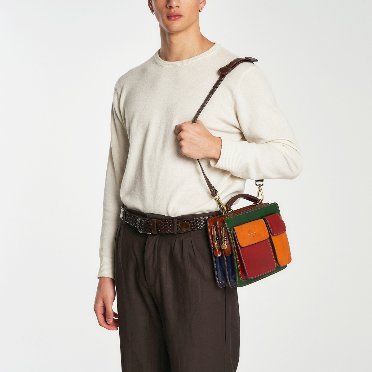 Laisse-toi séduire par le style audacieux de la Micros multicolore, la mallette compacte en cuir signée Fantini Pelletteria. Un design exceptionnel qui marie artisanat et personnalité affirmée, grâce à l’association vibrante de cuirs vert, rouge, orange et aux détails marron. Idéale pour ceux qui souhaitent se démarquer sans sacrifier la praticité : sur le devant, elle dispose de deux poches extérieures parfaites pour les objets à portée de main, tandis qu’à l’arrière une poche avec fermeture éclair métallique offre un espace supplémentaire sécurisé. À l’intérieur, deux larges compartiments avec zip, une pochette intérieure zippée, trois porte-stylos en cuir et un emplacement dédié pour le téléphone portable garantissent organisation et ordre. Équipée d’une bandoulière en cuir ajustable et amovible, la Micros multicolore est le choix idéal pour ceux recherchant une mallette professionnelle compacte au look inoubliable.