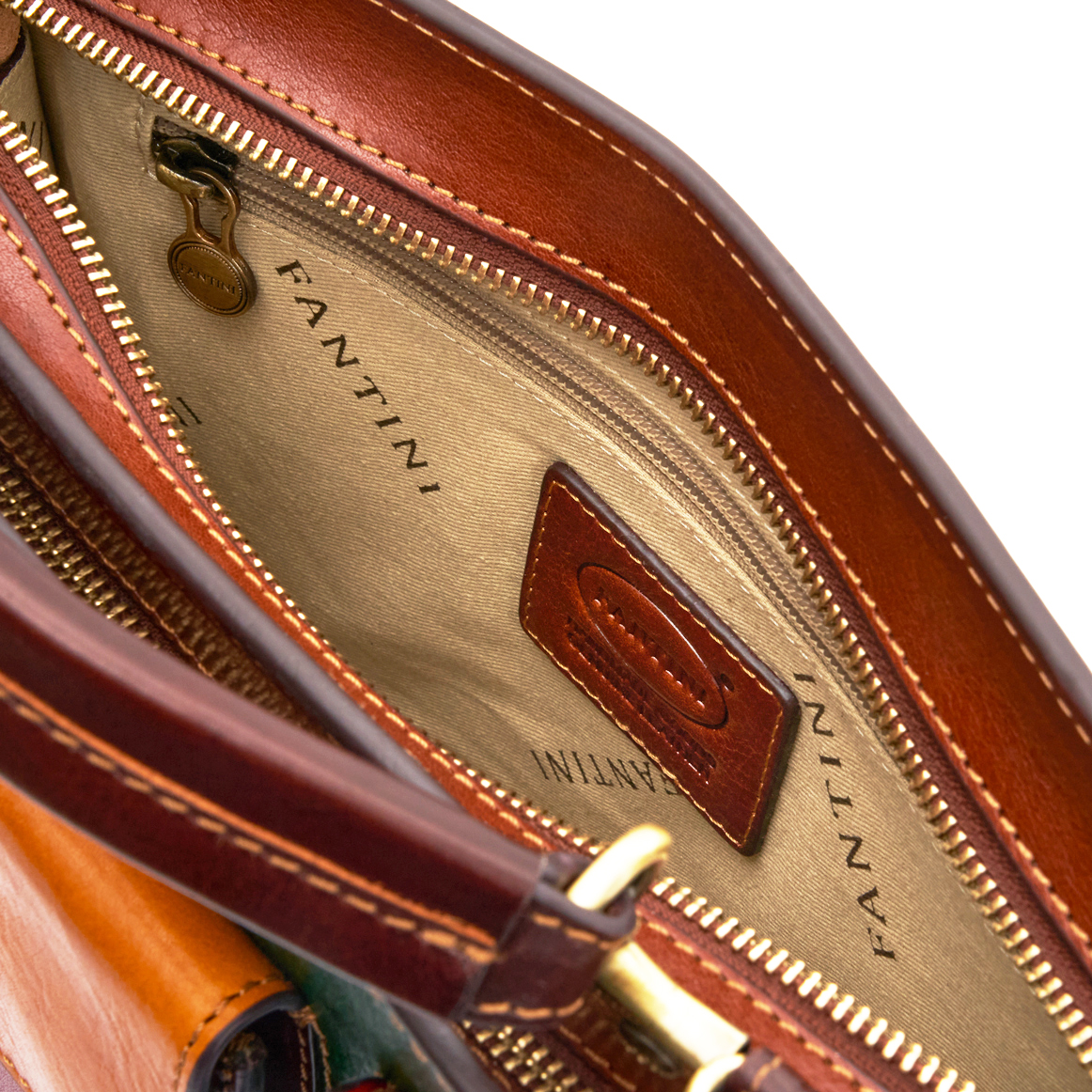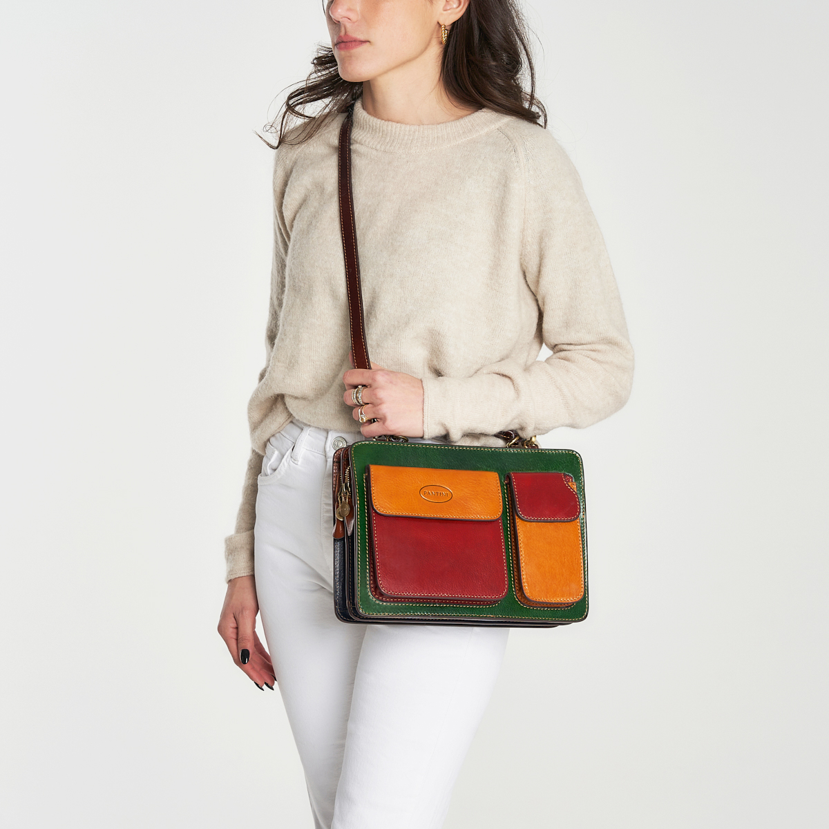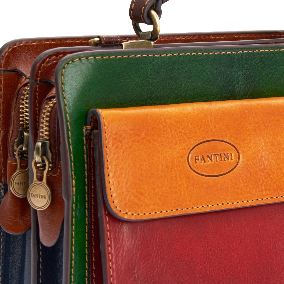 Laisse-toi séduire par le style audacieux de la Micros multicolore, la mallette compacte en cuir signée Fantini Pelletteria. Un design exceptionnel qui marie artisanat et personnalité affirmée, grâce à l’association vibrante de cuirs vert, rouge, orange et aux détails marron. Idéale pour ceux qui souhaitent se démarquer sans sacrifier la praticité : sur le devant, elle dispose de deux poches extérieures parfaites pour les objets à portée de main, tandis qu’à l’arrière une poche avec fermeture éclair métallique offre un espace supplémentaire sécurisé. À l’intérieur, deux larges compartiments avec zip, une pochette intérieure zippée, trois porte-stylos en cuir et un emplacement dédié pour le téléphone portable garantissent organisation et ordre. Équipée d’une bandoulière en cuir ajustable et amovible, la Micros multicolore est le choix idéal pour ceux recherchant une mallette professionnelle compacte au look inoubliable.