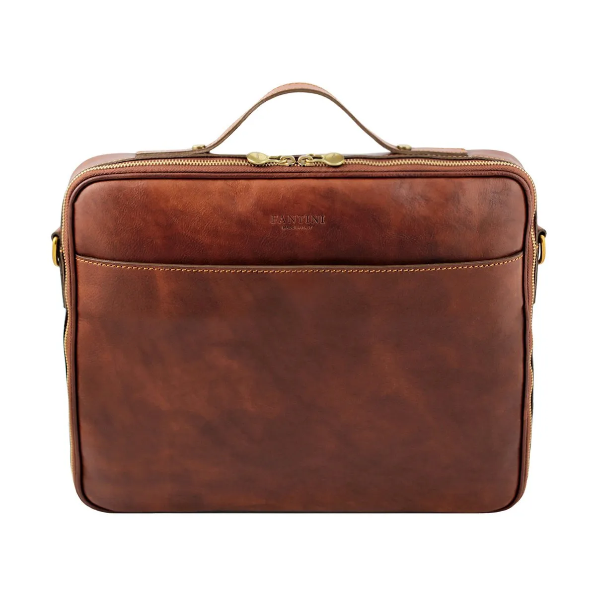 Lorsque l’on travaille et étudie, un ordinateur portable devient un outil indispensable, souvent à emporter au bureau ou en classe. Pour cela, Fantini Pelletteria vous propose l’accessoire idéal : une sacoche pour ordinateur fabriquée en cuir naturel de manière artisanale. Le cuir marron est d’une qualité exceptionnelle, résistant et durable dans le temps. Cet article présente une forme rectangulaire semi-rigide avec un compartiment avant doté d’un aimant et à l’arrière une bande en cuir permettant de le fixer sur un trolley. Cette sacoche peut être portée à la main grâce à sa poignée épaisse et confortable ou sur l’épaule avec sa bandoulière réglable et amovible. La fermeture de la bandoulière se fait par une zip métallique, tandis que l’intérieur doublé de coton offre suffisamment d’espace ainsi qu’une poche supplémentaire. Ce modèle de sac pour ordinateur en cuir est prisé par tous ceux qui sont constamment en déplacement durant la journée sans sacrifier leur élégance ni leur appareil !