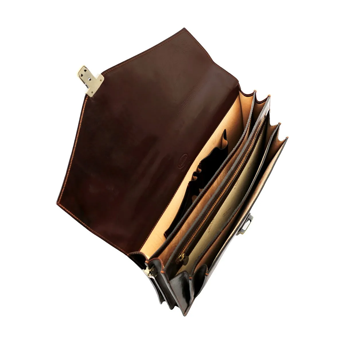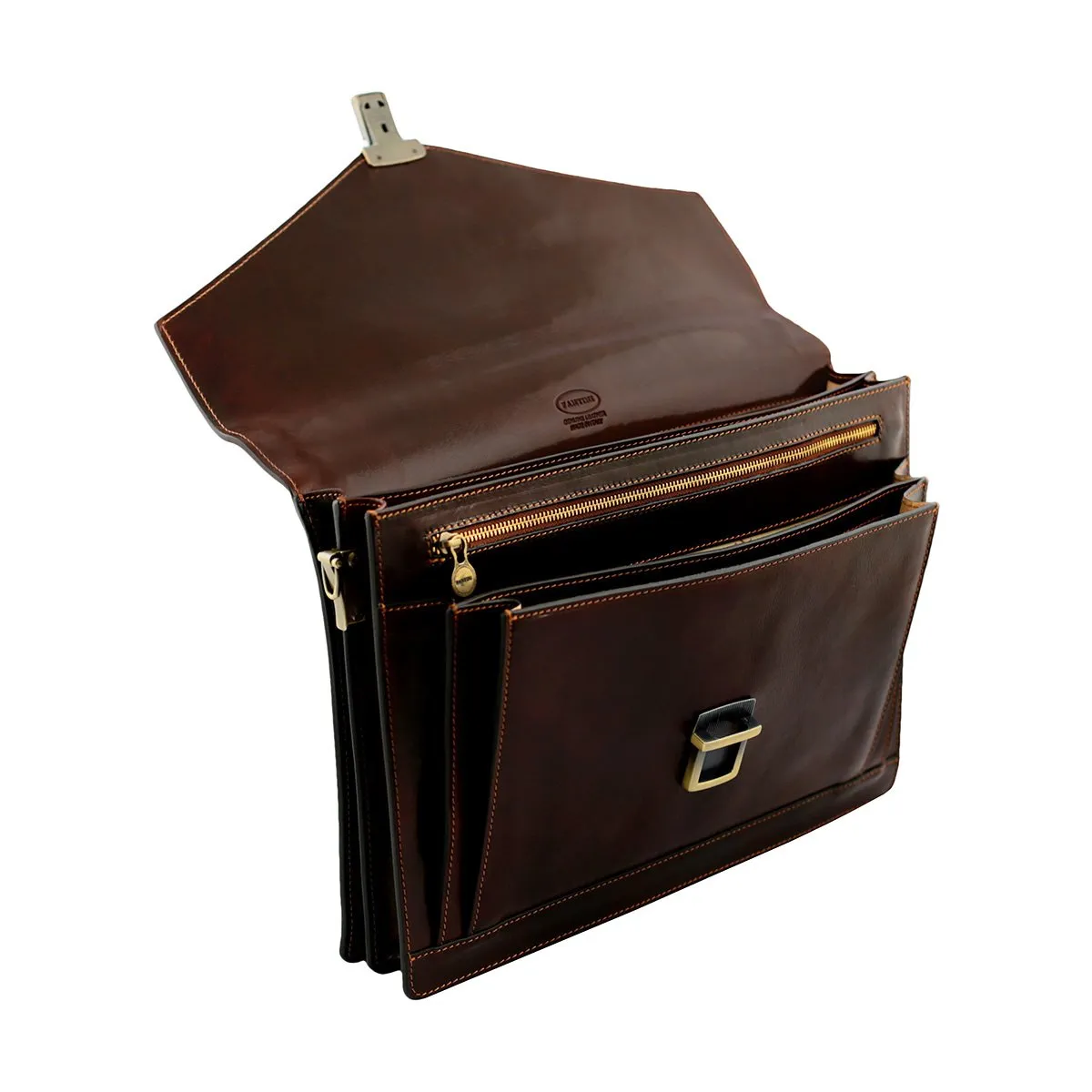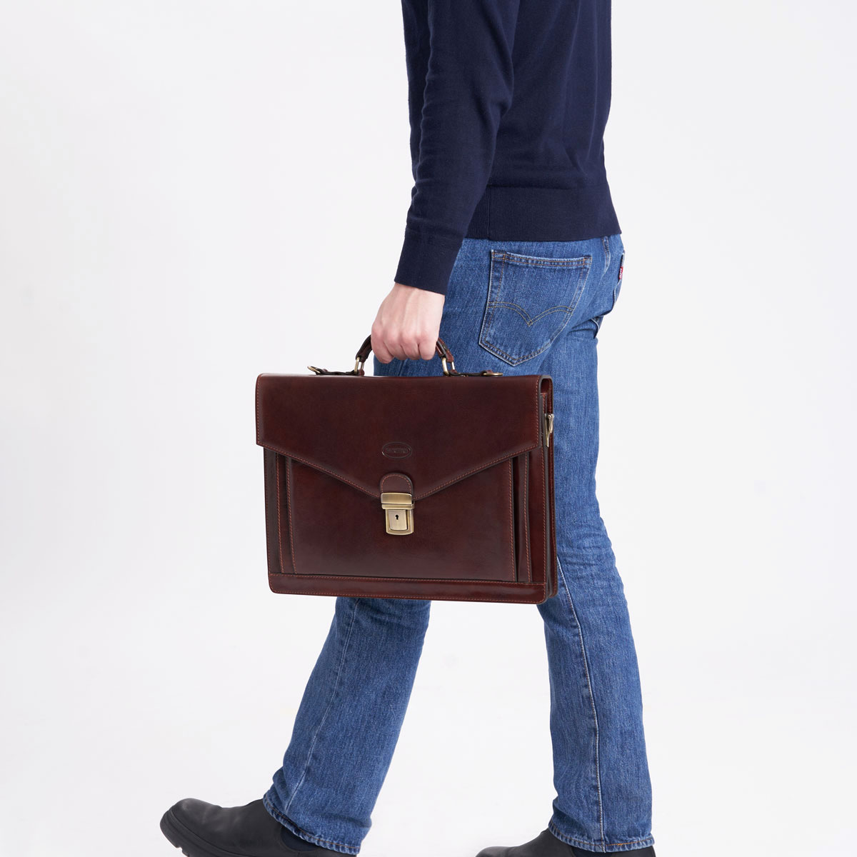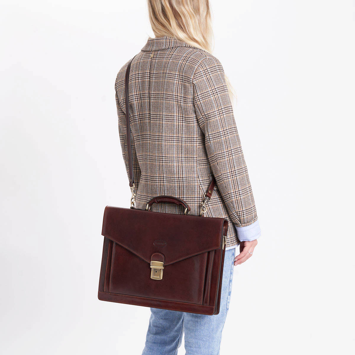 Ce sac, parfait pour avocats, professionnels et hommes d’affaires, est l’un des accessoires les plus élégants que notre maroquinerie propose pour le milieu professionnel. La mallette en cuir Shanghai de couleur marron est confectionnée à partir de cuirs italiens robustes grâce à un savoir-faire artisanal. Pratique et chic, ce modèle se distingue par sa fermeture rabattable sécurisée avec une clé fournie, son anse en cuir renforcé ainsi qu’une bandoulière amovible ajustable selon vos besoins. À l’intérieur, deux grands compartiments permettent d’organiser efficacement vos effets personnels ou documents professionnels tels qu’un ordinateur portable ou divers dossiers. L’élégant ton marron s’associe harmonieusement avec une chemise et une cravate. Apportez sophistication et style à votre quotidien professionnel avec votre nouvelle mallette en cuir Shanghai.