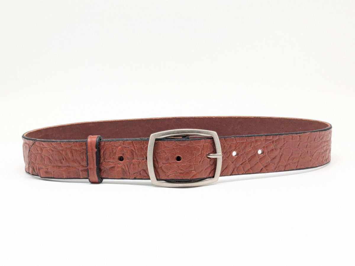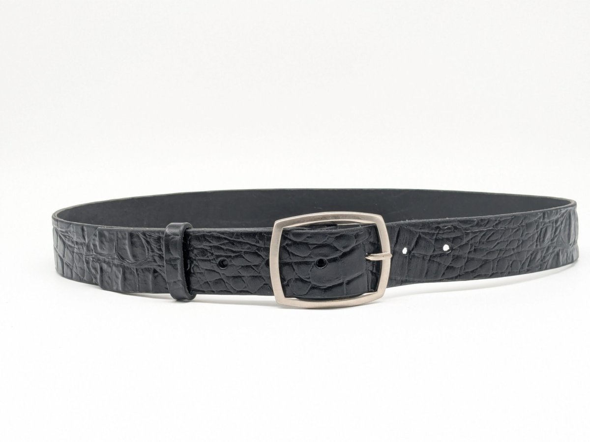 Cette ceinture en cuir imprimé fait partie de nos ceintures haut de gamme, abacarrée sur les côtés et teintée en noir sur les tranches.