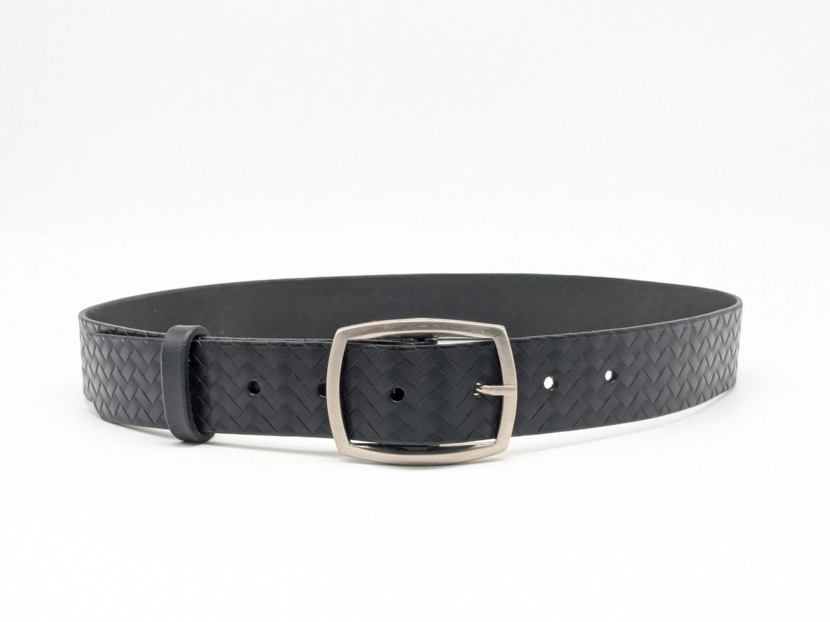 Cette ceinture en cuir imprimé fait partie de nos ceintures haut de gamme, abacarrée sur les côtés et teintée en noir sur les tranches.