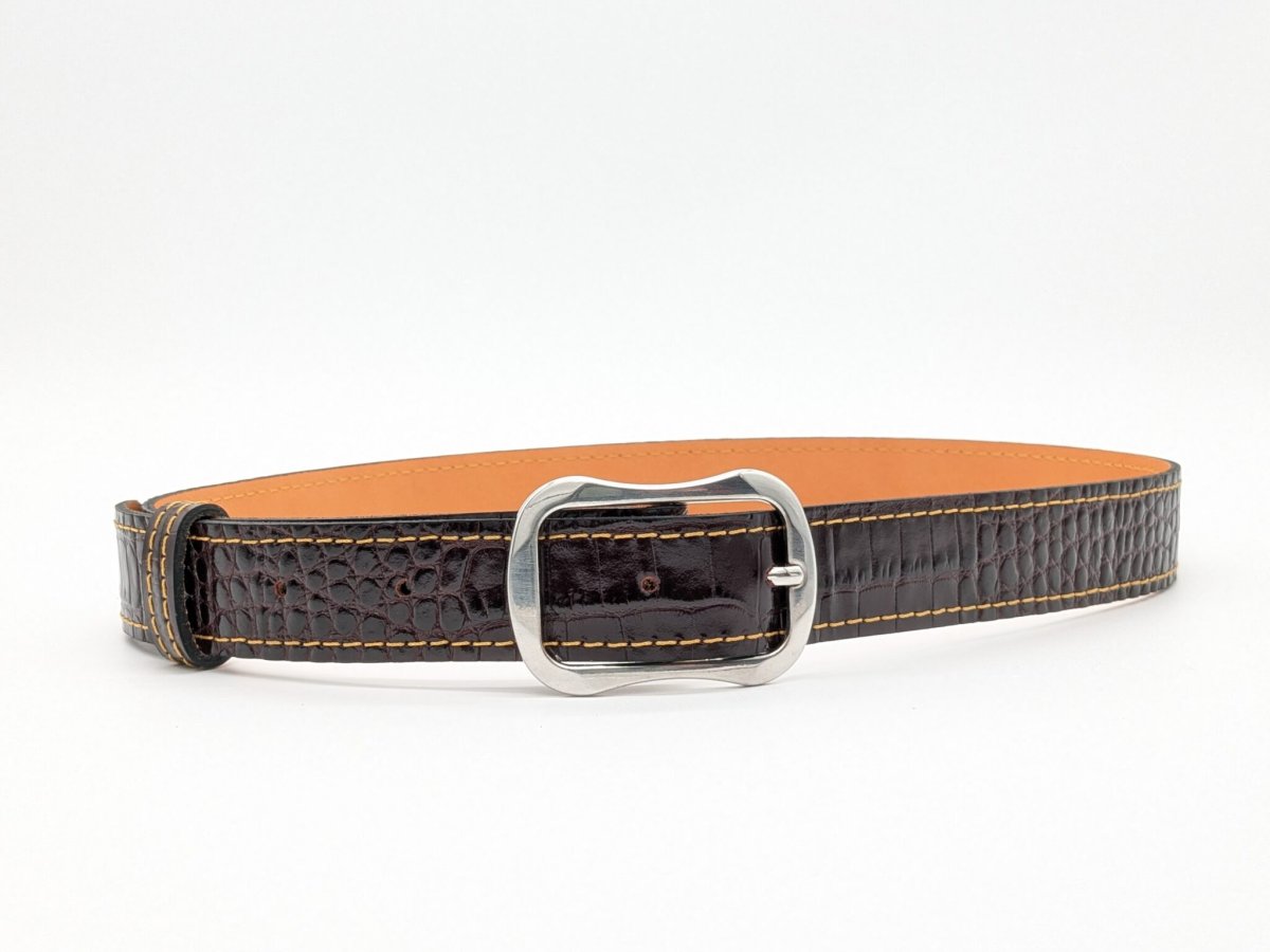 Ceinture imprimée Croco marron en cuir de vachette, artisanale. Made in France, nos produits ont été confectionné dans notre atelier en Mayenne. Nous prêtons une grande attention à la qualité du cuir et nous fournissons en Espagne.