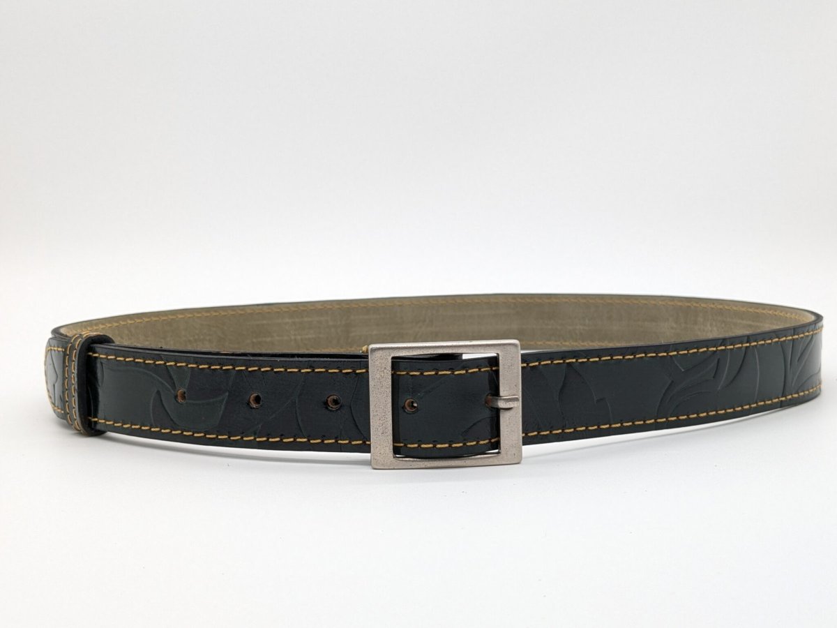 Cette ceinture haut de gamme, élégante, fait 2.8 cm de large et 3.3 mm d’épaisseur. Elle a été doublée cuir, imprimée flower vert canard. Très souple et agréable à porter, elle conviendra à différentes tenues.