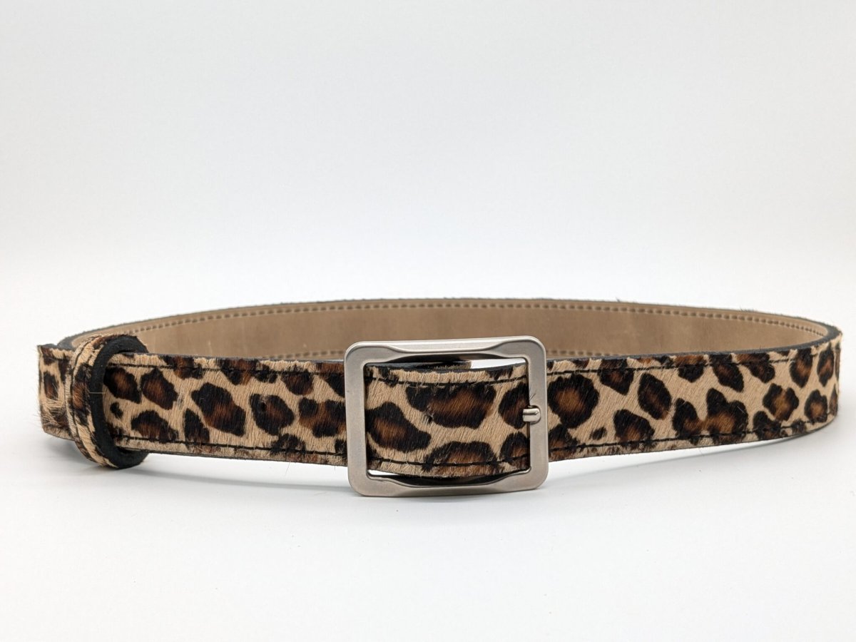 Cette ceinture haut de gamme, élégante, fait 2.8 cm de large et 3.3 mm d’épaisseur. Elle a été doublée cuir, imprimée poils léopard et piquée. Très souple et agréable à porter, elle conviendra à différentes tenues.