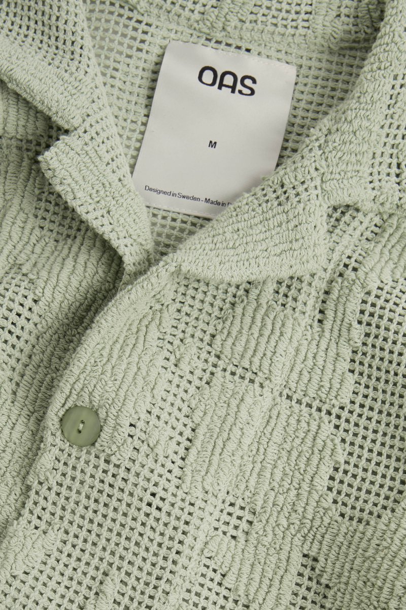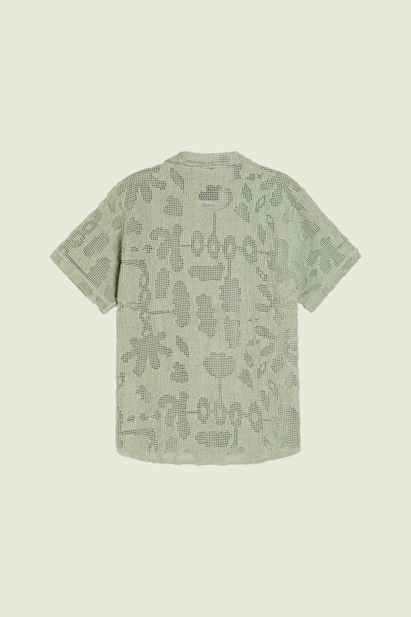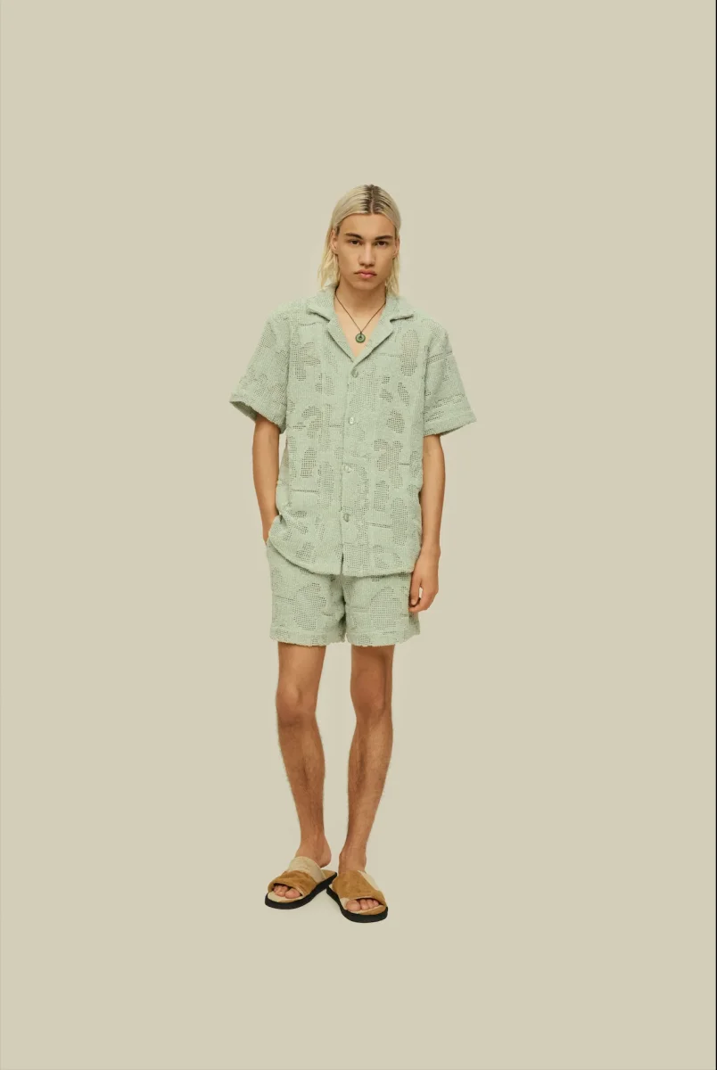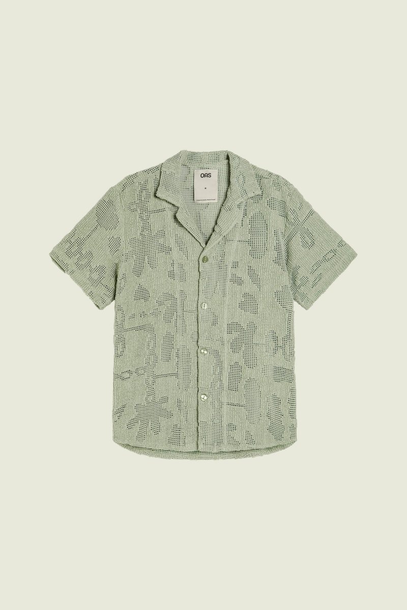 Déclinée dans un vert galbanum rafraîchissant, cette chemise en maille ajourée réinvente l’élégance estivale. Son motif texturé en crochet joue sur la transparence et laisse subtilement respirer la peau. Dotée d’un col resort et de boutons ton sur ton, elle conjugue légèreté et sophistication. À porter ouverte sur un maillot ou boutonnée pour une silhouette plus structurée.