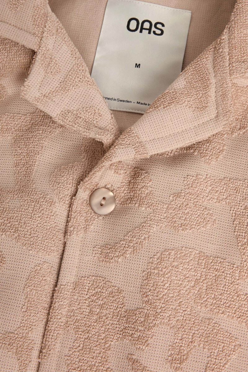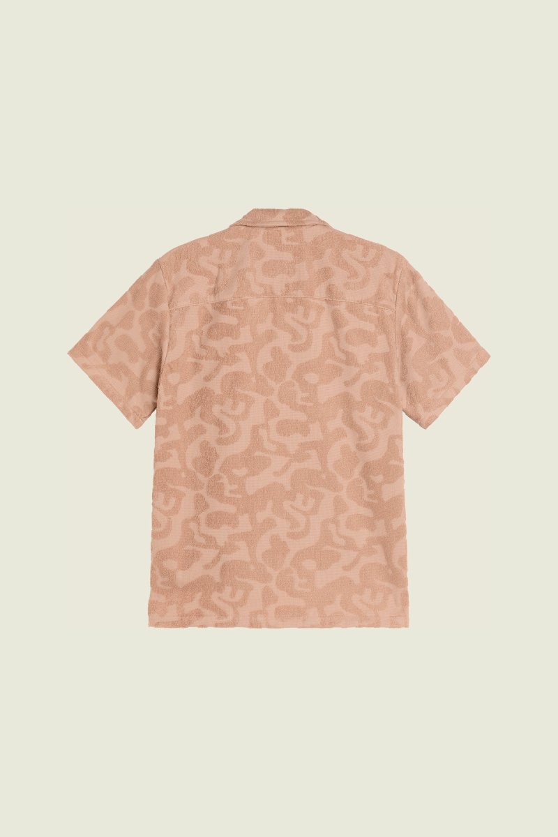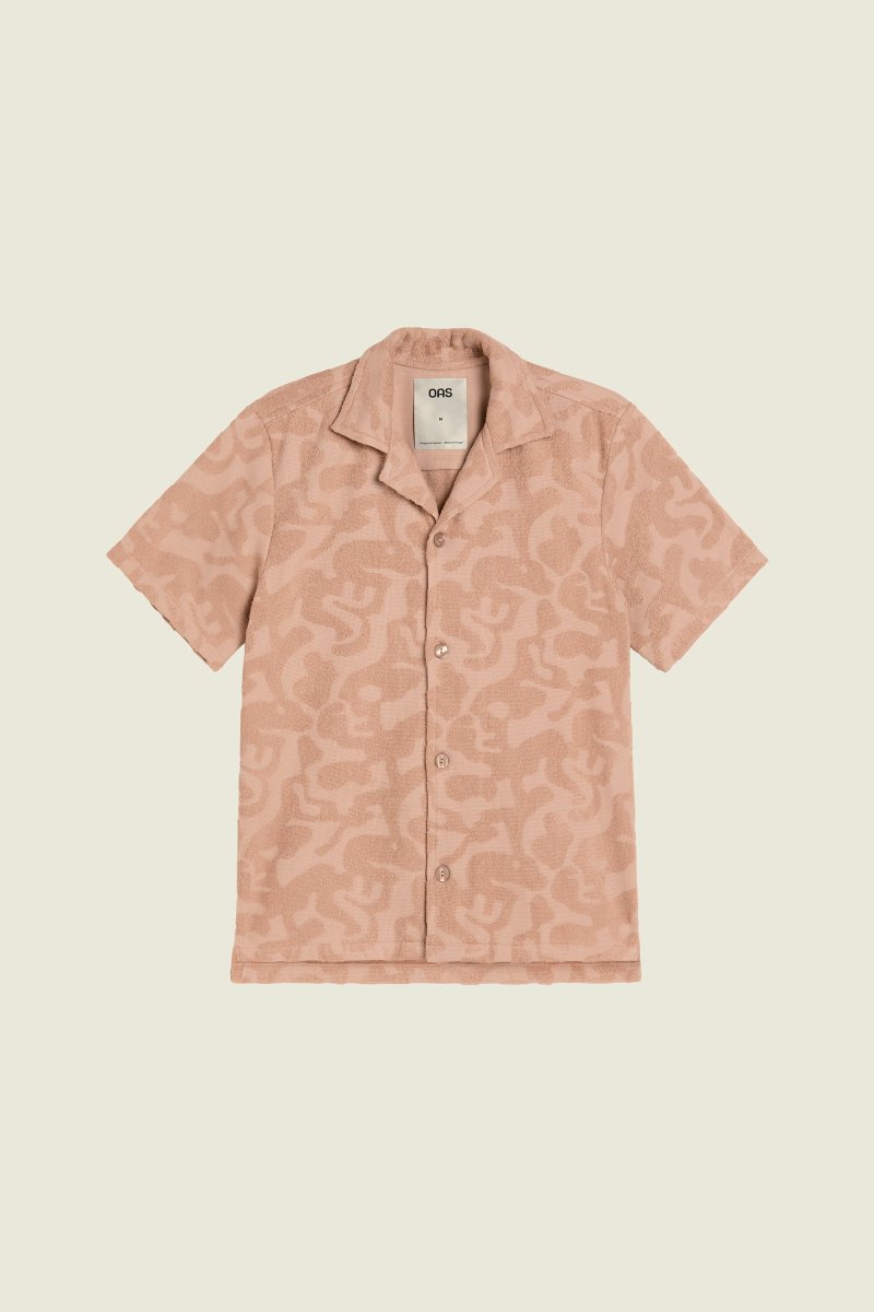 Dans sa teinte saumon chaude comme une fin d’après-midi, cette chemise a tout d’un coucher de soleil qu’on n’a pas envie de voir disparaître. En matière éponge douce et texturée, elle dessine des vagues irrégulières, comme un souffle sur la peau ou une mer qui refuse d’être domptée.