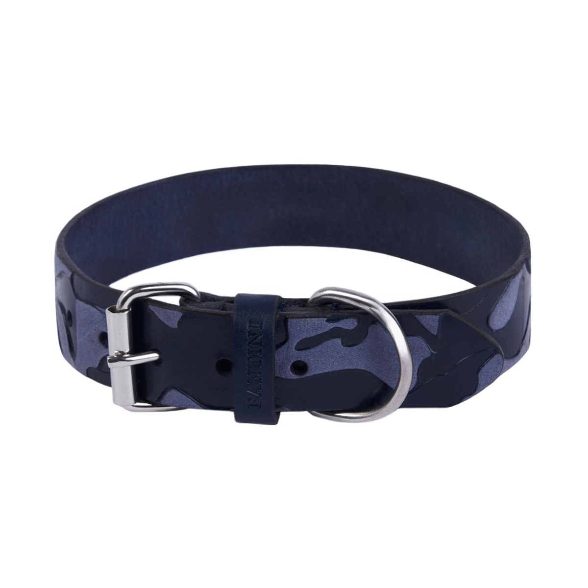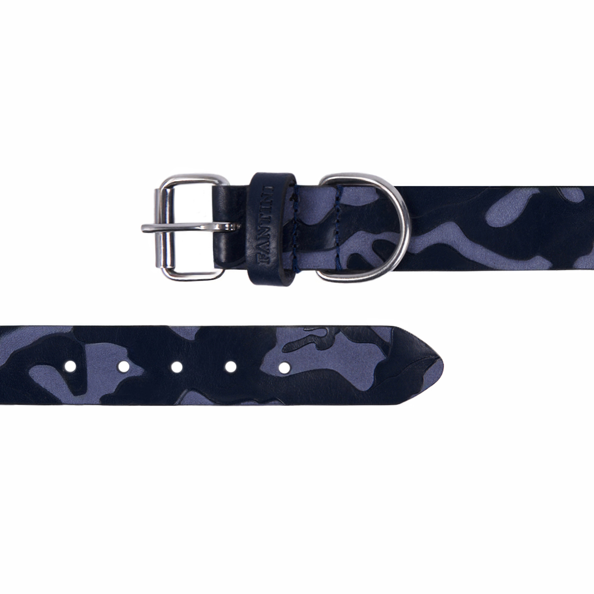 Ce collier pour chiens en véritable cuir bleu à motif camouflage est le choix parfait pour ceux qui recherchent un accessoire unique, durable et soigné dans les moindres détails. Fabriqué artisanalement en Italie, il est confectionné à partir de cuir naturel de qualité supérieure et orné d’une finition camouflée qui offre une harmonie moderne et raffinée des teintes. Adapté aux chiens de toutes tailles – petite, moyenne ou grande – il assure un ajustement stable et confortable, idéal pour une utilisation quotidienne. La boucle et l’anneau en acier garantissent robustesse et longévité, offrant ainsi une fermeture sécurisée et un lien fiable avec la laisse. Le logo “FANTINI” gravé au fer sur la sangle en cuir souligne l’authenticité du produit Made in Italy. Livré dans une boîte ornée du logo Fantini et accompagné d’une garantie de 24 mois, ce collier a été conçu pour allier esthétique et praticité.