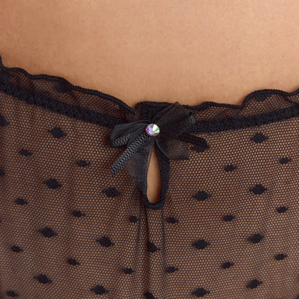 Mesh stretch à pois avec bord froncé Ouverture en forme de goutte à l’avant Nœud en organza et gros-grain à l’avant avec détail gemme iridescente Grande ouverture en forme de goutte avec ruban organza fixe