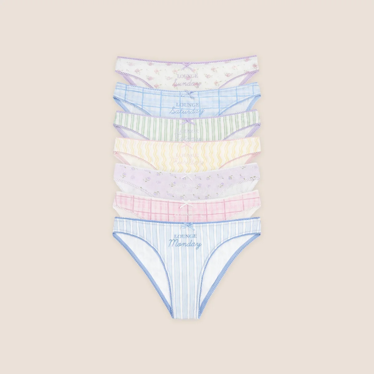 Fabrication imprimée en pointelle stretch et douce Logo Lounge et jour de la semaine brodés Détail élastique en picot Les lots de bas ne sont pas inclus dans l’offre culottée.
