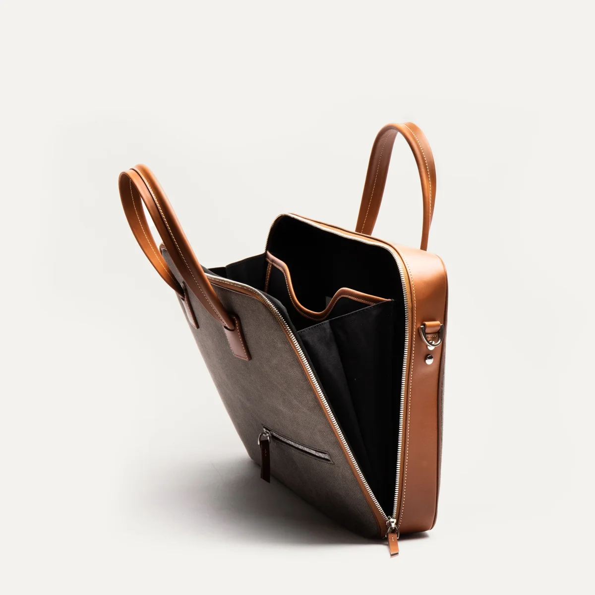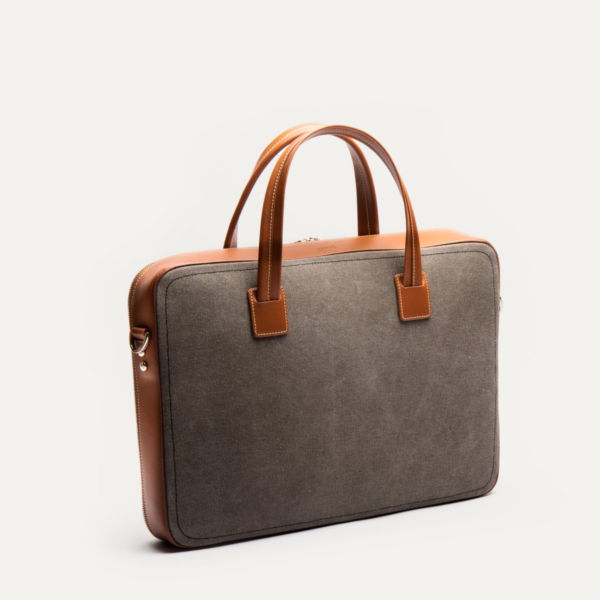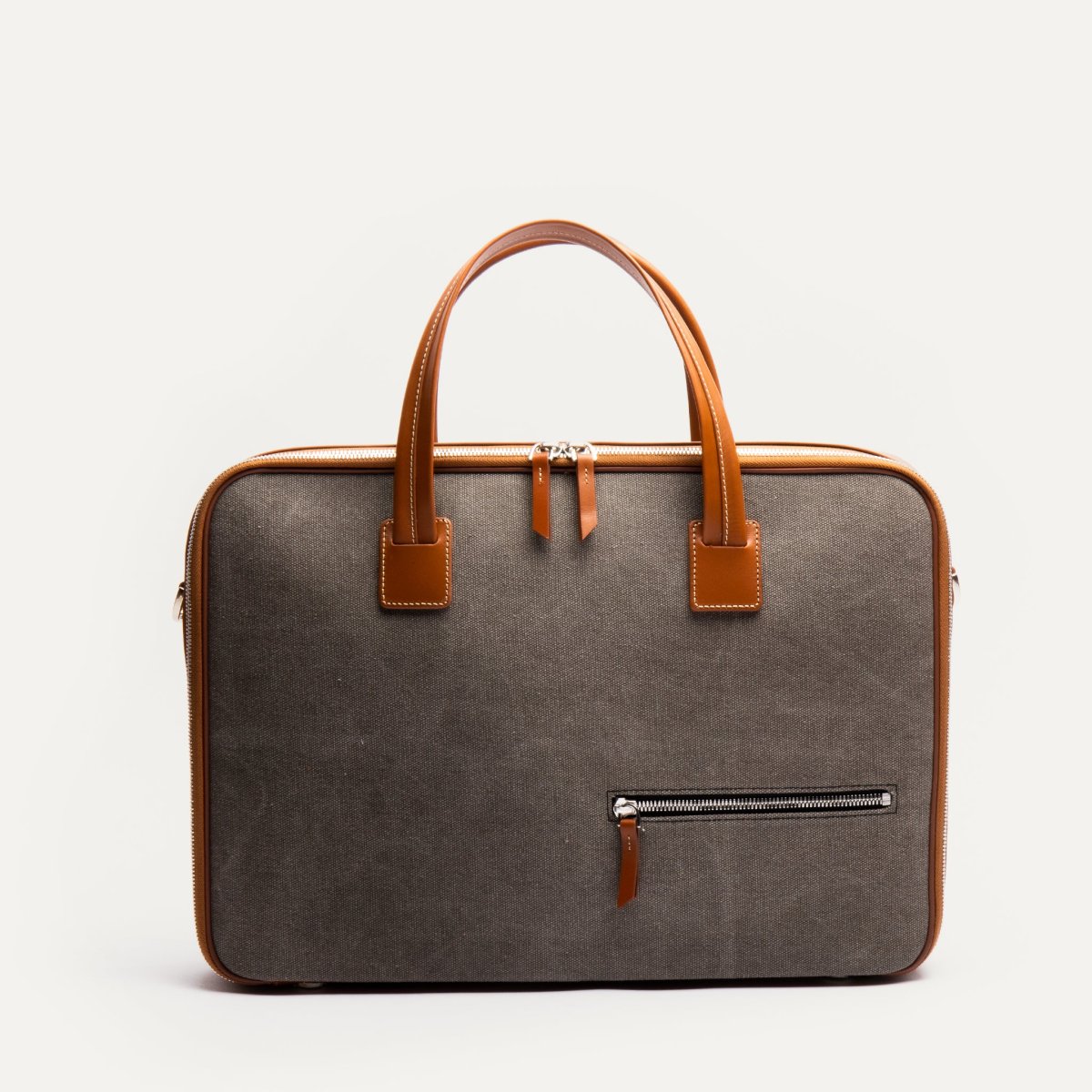 L’association du gris de notre toile de coton huilée à notre cuir cognac donne une vraie touche d’originalité à ce porte-documents qui deviendra le compagnon idéal de vos déplacements professionnels. Un format très compact qui regorge de solutions de rangement et les matières utilisées ont également été choisies pour leur qualité et leur résistance, à l’image des poches en Néoprène qui viendront accueillir vos objets les plus fragiles.