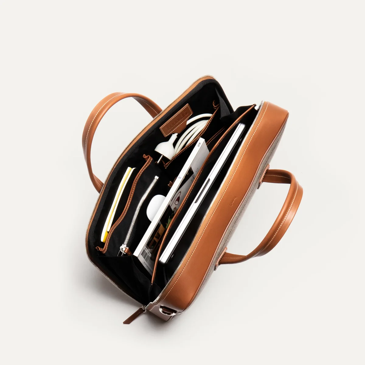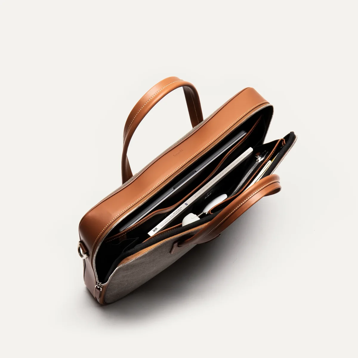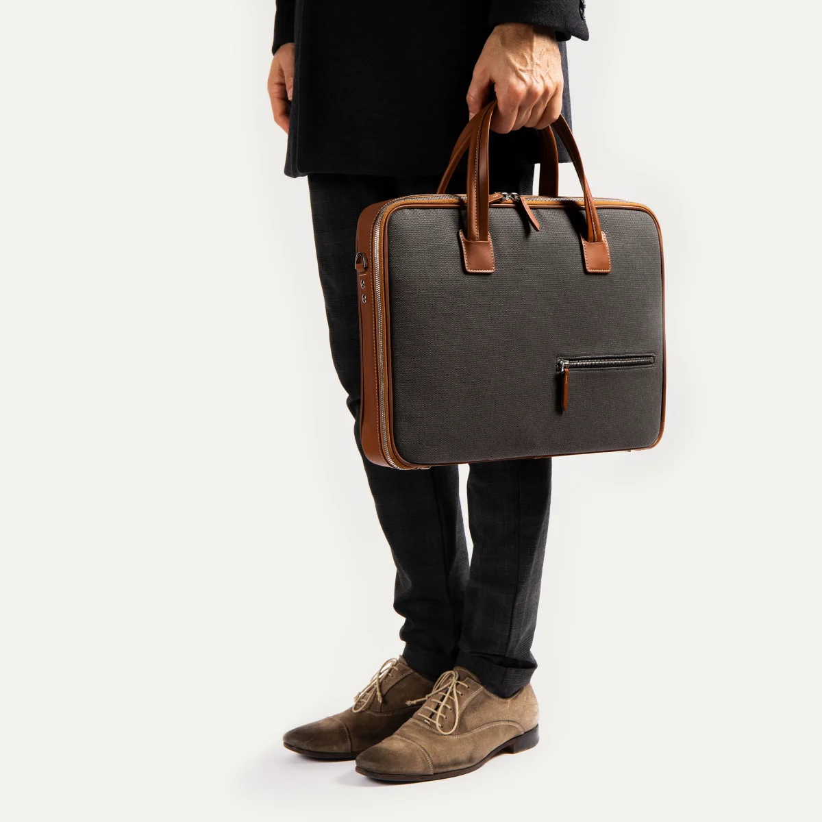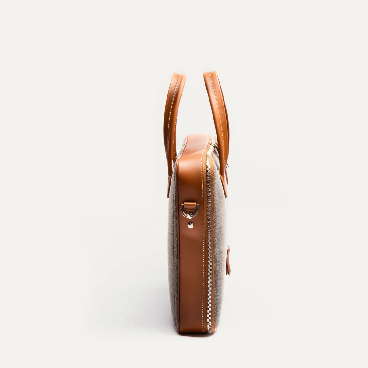 L’association du gris de notre toile de coton huilée à notre cuir cognac donne une vraie touche d’originalité à ce porte-documents qui deviendra le compagnon idéal de vos déplacements professionnels. Un format très compact qui regorge de solutions de rangement et les matières utilisées ont également été choisies pour leur qualité et leur résistance, à l’image des poches en Néoprène qui viendront accueillir vos objets les plus fragiles.