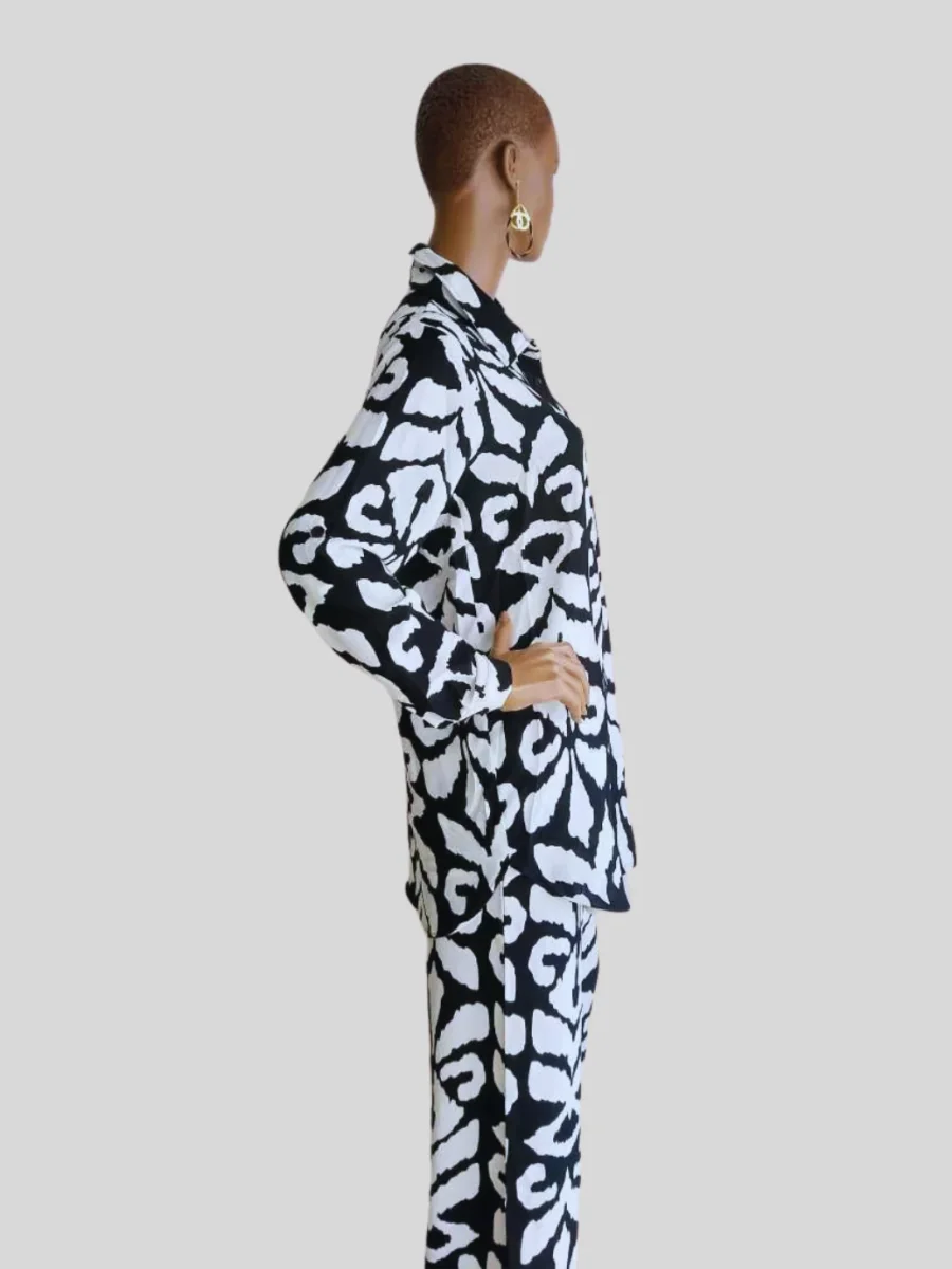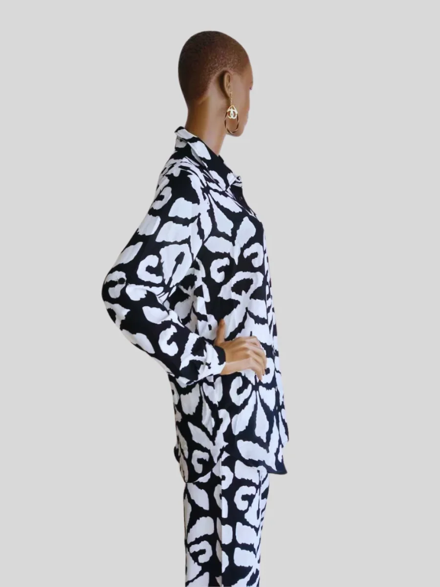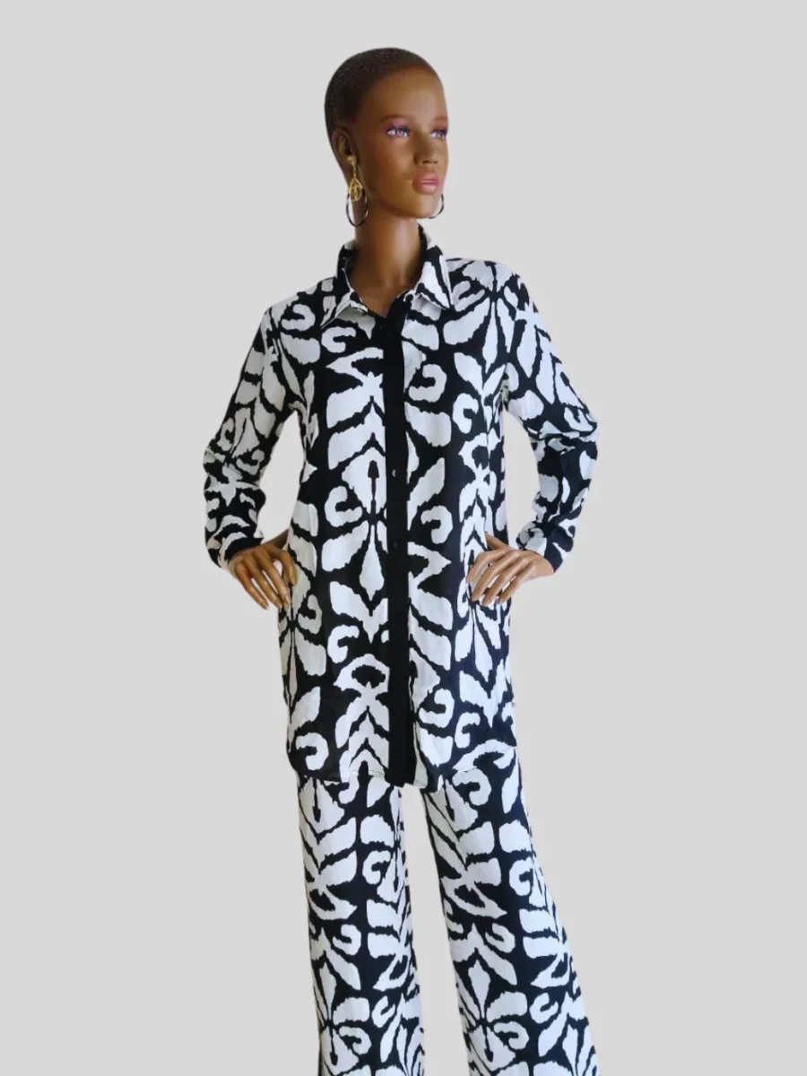 Découvrez l’élégance intemporelle de notre ensemble chemise et pantalon imprimé noir et blanc. Faites sensation avec son motif imprimé unique. Le contraste des couleurs crée un look moderne et chic, parfait pour toutes les occasions.