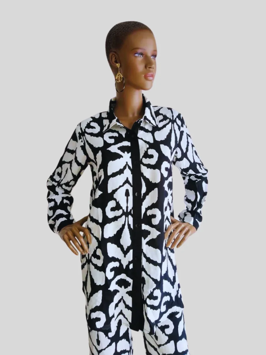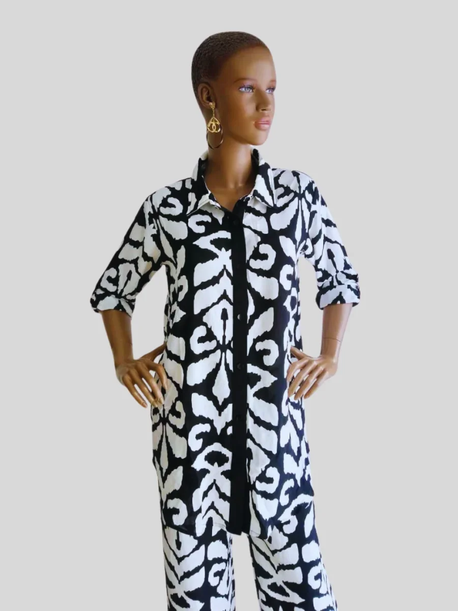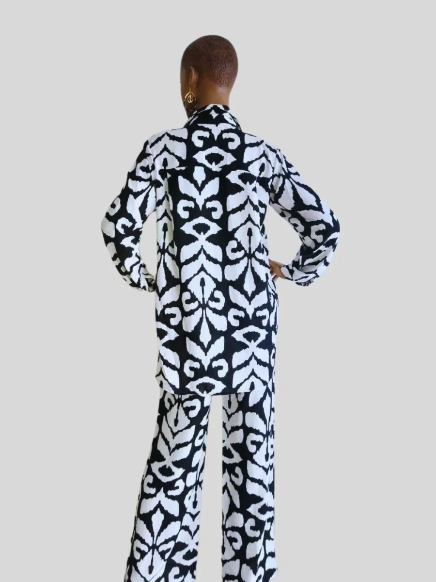 Découvrez l’élégance intemporelle de notre ensemble chemise et pantalon imprimé noir et blanc. Faites sensation avec son motif imprimé unique. Le contraste des couleurs crée un look moderne et chic, parfait pour toutes les occasions.