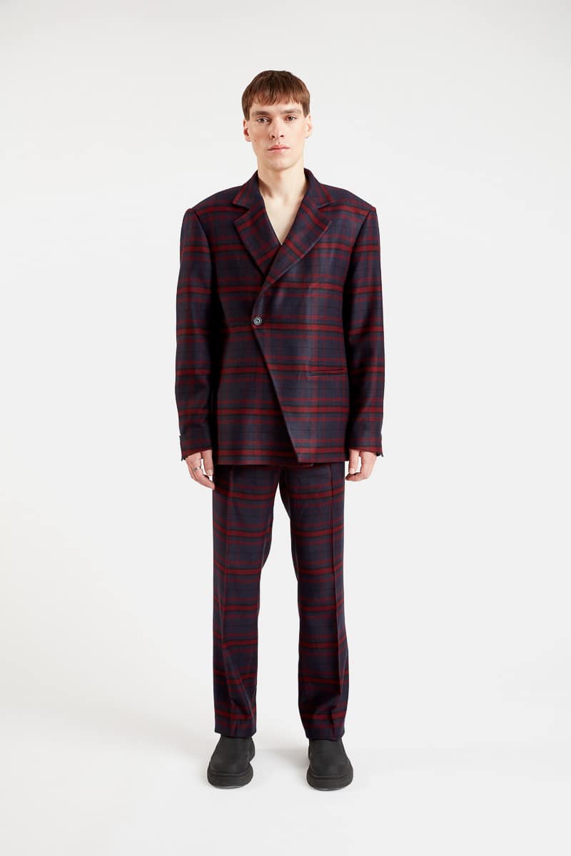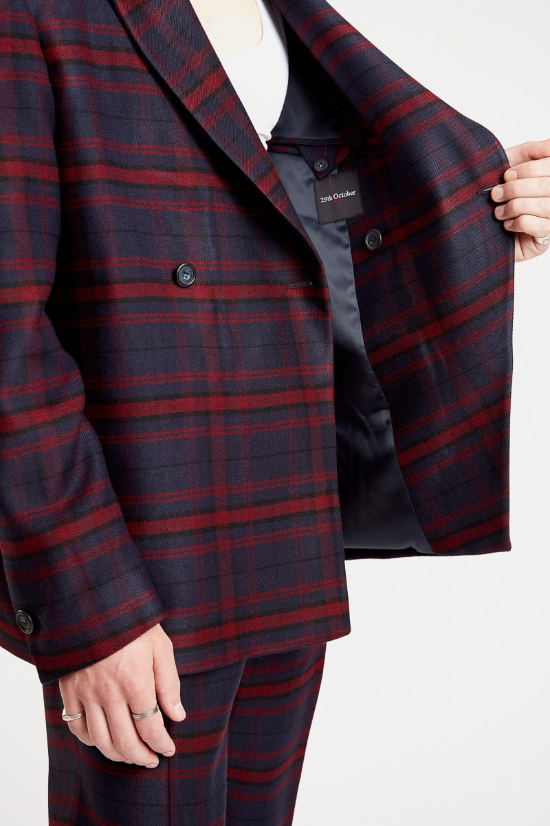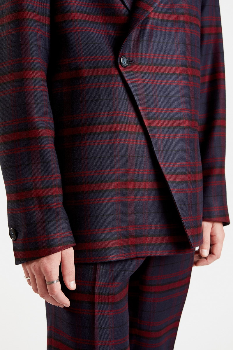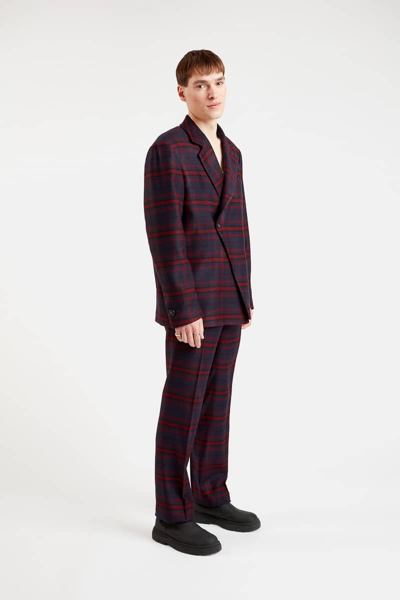 Cette veste technique en laine à carreaux violet couleur bleu marine présente une coupe droite confort, un col revers cranté, des épaulettes pour marquer la carrure, une fermeture croisée à bouton simple, une poche passepoilée extérieure et deux poches intérieures. À la fois minimaliste et sophistiquée, la veste Fū propose un style élégant et confirmé. Elle peut s’associer au pantalon Chi pour un look complet, fashion et tendance.