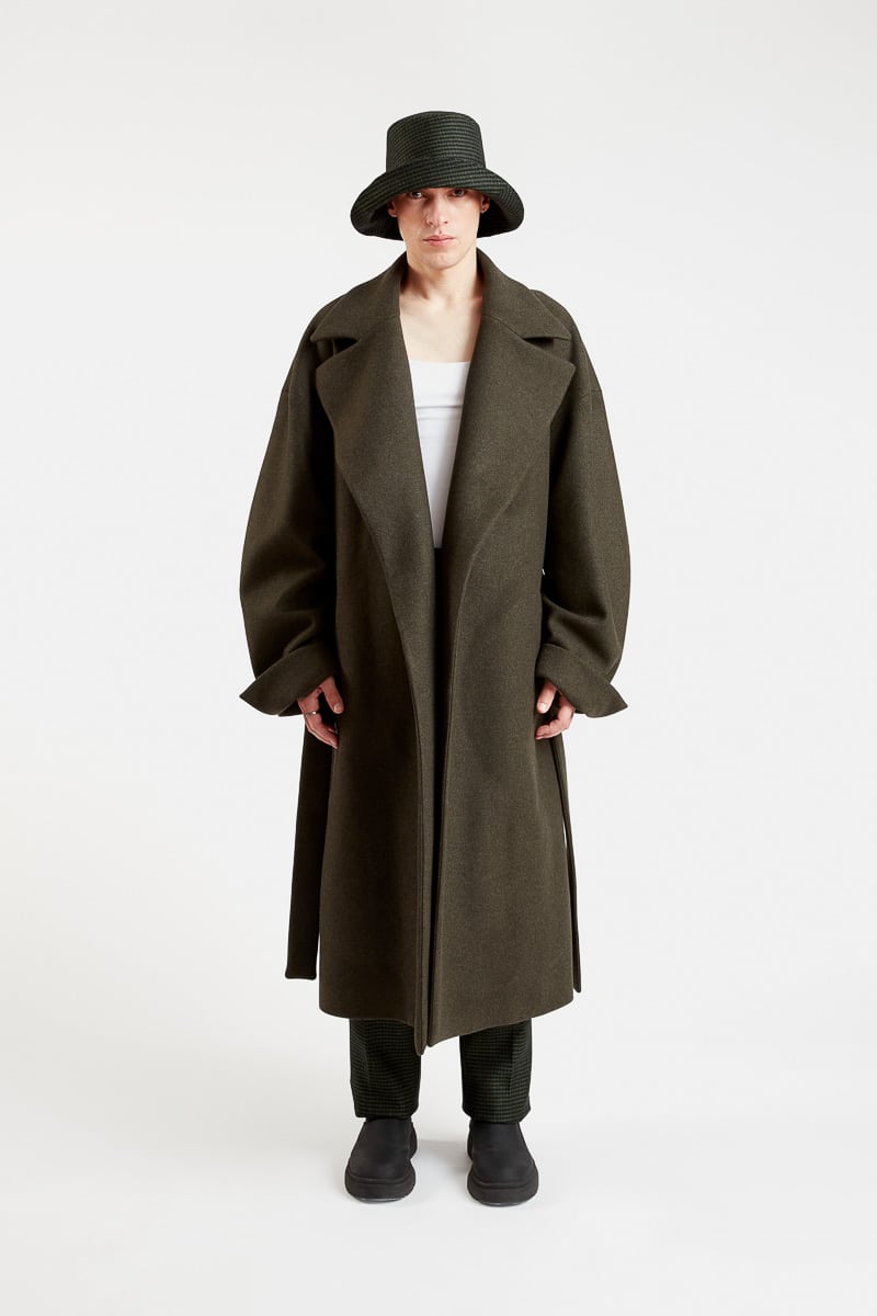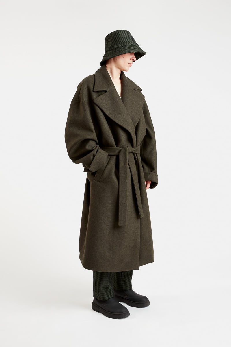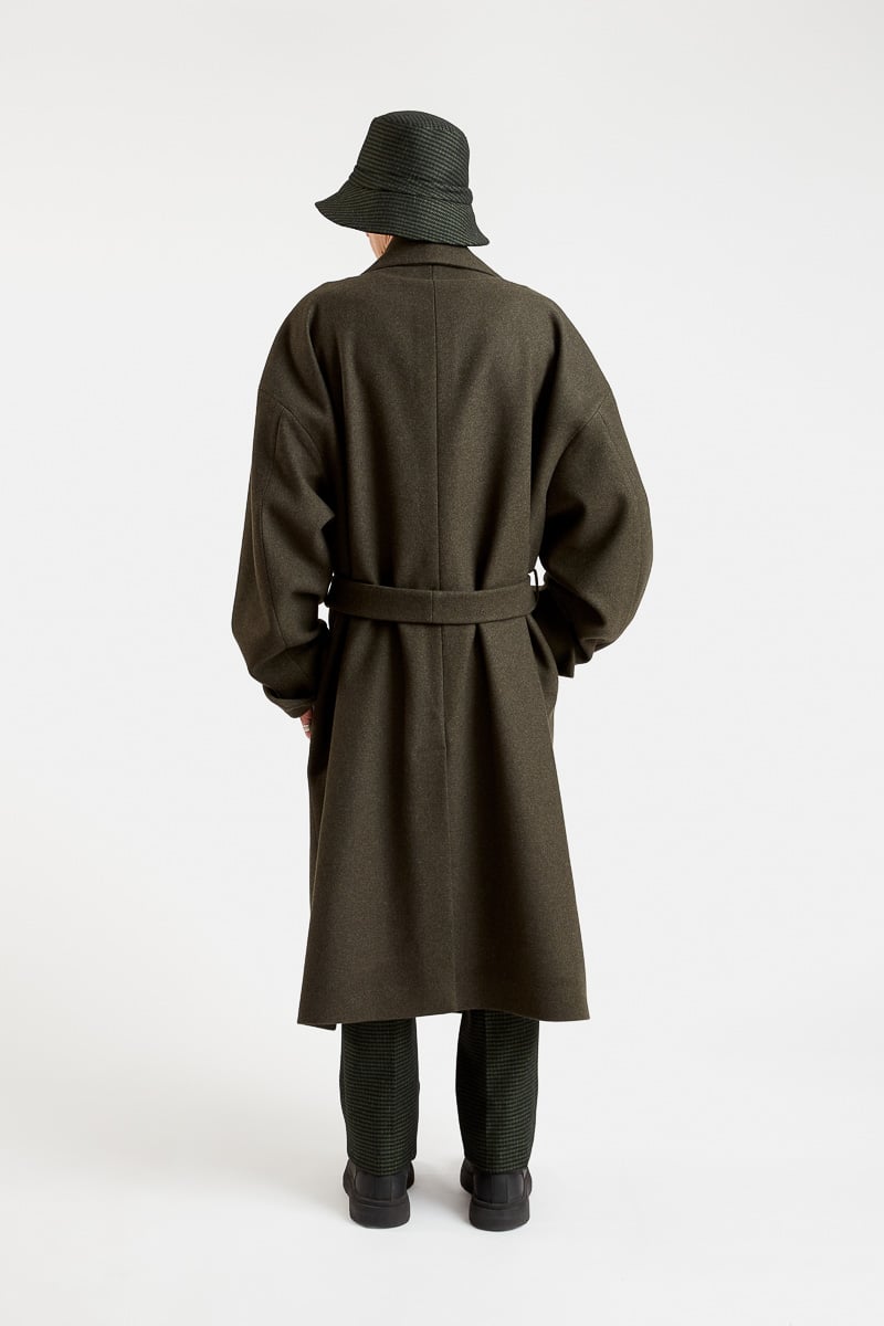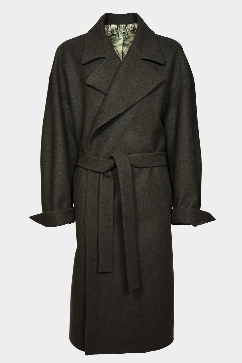 Ce long manteau super oversize style kimono confectionné en pure laine vert kaki, présente une coupe ample, une fermeture croisée avec ceinture, un grand col revers, une doublure imprimée à motifs paysage japonais, deux poches latérales, deux poches intérieures et une fente d’aisance dans le bas du dos. Le modèle Fuji allie à la fois un style épuré, raffiné et moderne. Ce manteau chaud et confortable se distingue par son volume très ample et s’associera à toutes vos tenues d’hiver.