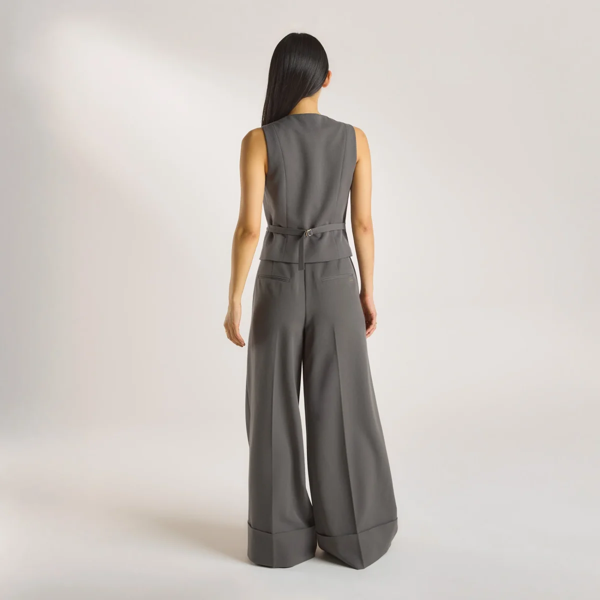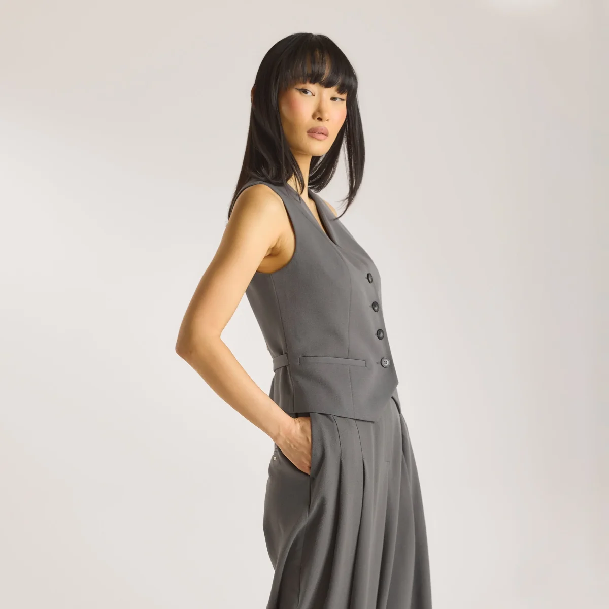 Gilet ajusté Détail de couture sur toute la longueur sous la poitrine Encolure en V Fausse poches à l’avant Boutons avec logo gravé Doublure intérieure douce Chaîne au dos du col Réglage à l’arrière Eléments dorés brossés sur le gilet