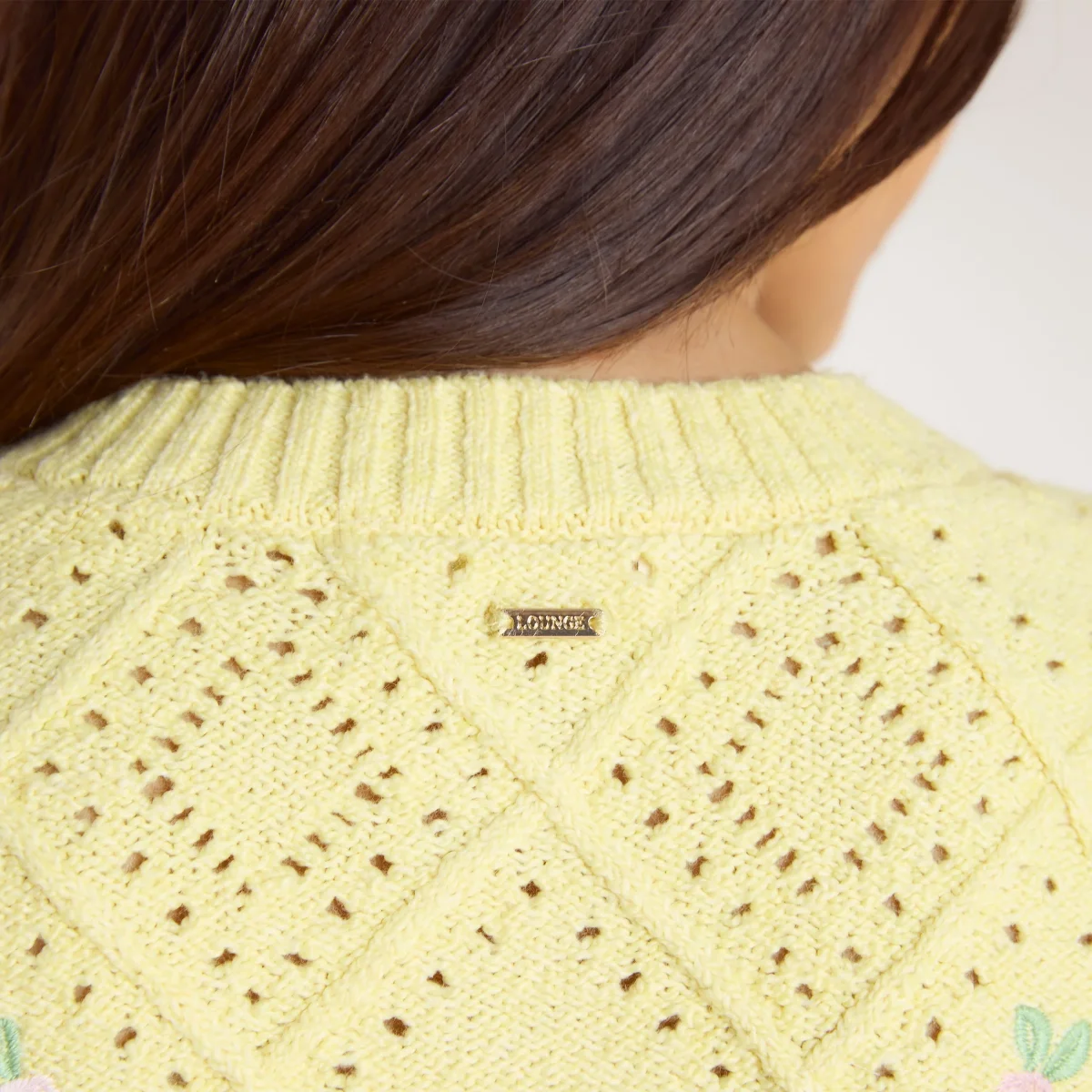 Cardigan court Maille ajourée épaisse en coton avec détail en maille torsadée Motif brodé floral Col et ouverture devant en maille côtelée Poignets et ourlet larges en maille côtelée Fermeture par boutons marbrés Étiquette dorée gravée du logo au centre du dos
