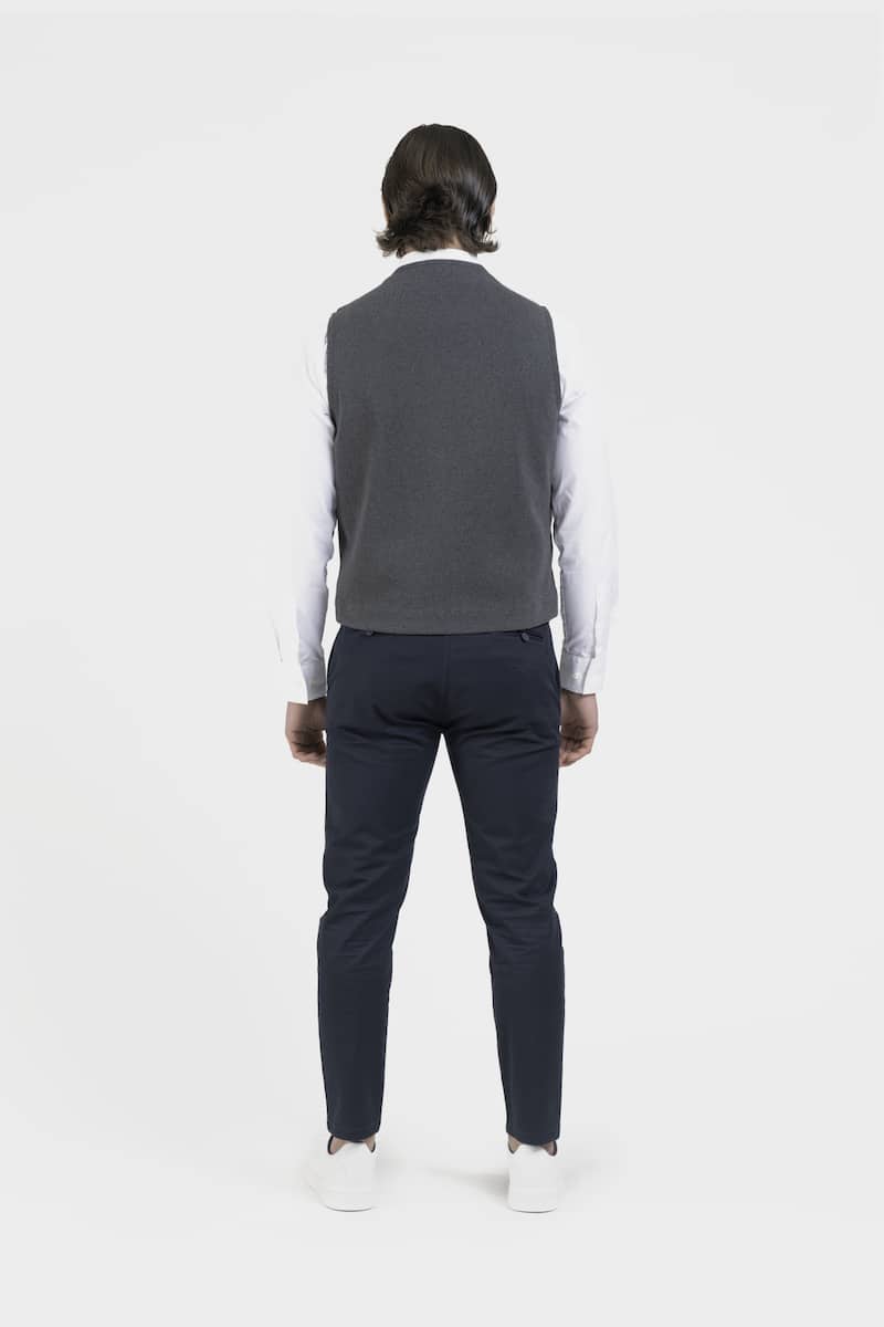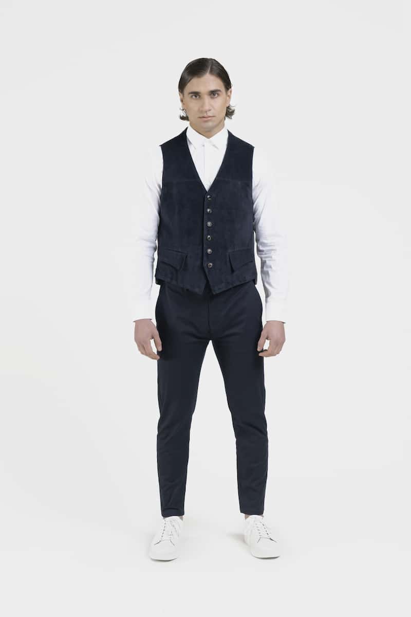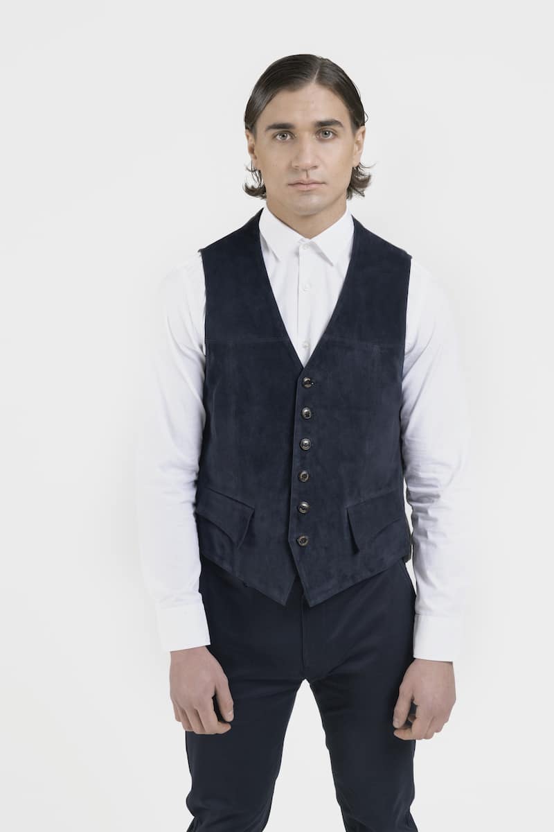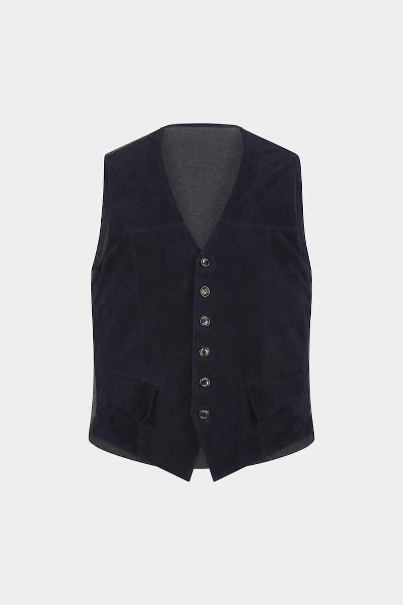 Ce gilet élégant style anglais sans col en daim chèvre velours couleur bleu marine et tissu jersey présente deux poches avec rabats et une fermeture centrale à boutons. Le modèle Harold propose un style épuré et raffiné.