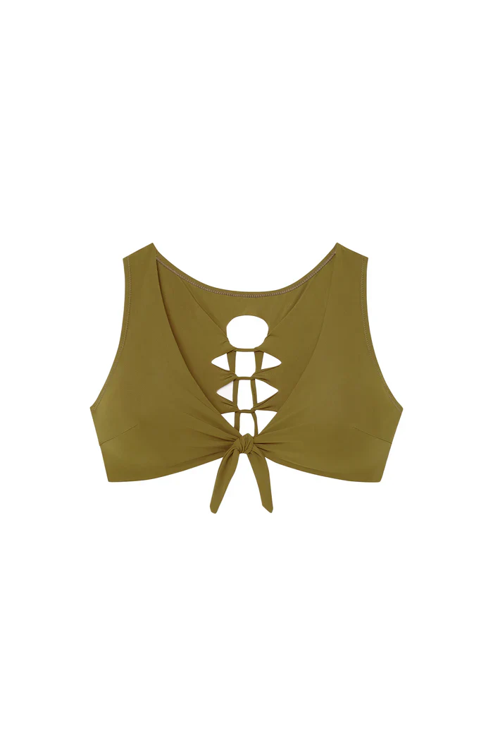 TECLA de la maison Pain de Sucre réinvente l’esprit bikini avec une allure contemporaine et sensuelle. Ce haut de maillot crop-top se noue délicatement à l’entre-seins, dessinant un décolleté féminin qui met en valeur la silhouette. Dans le dos, un élégant jeu de laçage façon crochet ajouré dévoile subtilement la peau hâlée pour un effet graphique et raffiné. Ses bonnets montés en fourreau, doublés pour plus de confort et de maintien, conviennent également aux poitrines généreuses. Réalisé en 71 % polyamide et 29 % élasthanne, il conjugue confort et style. En bronze, une teinte minérale mêlant jaune et vert, il apporte une touche authentique et solaire. La mannequin mesure 1,76 m et porte une taille XS (83/62/91).