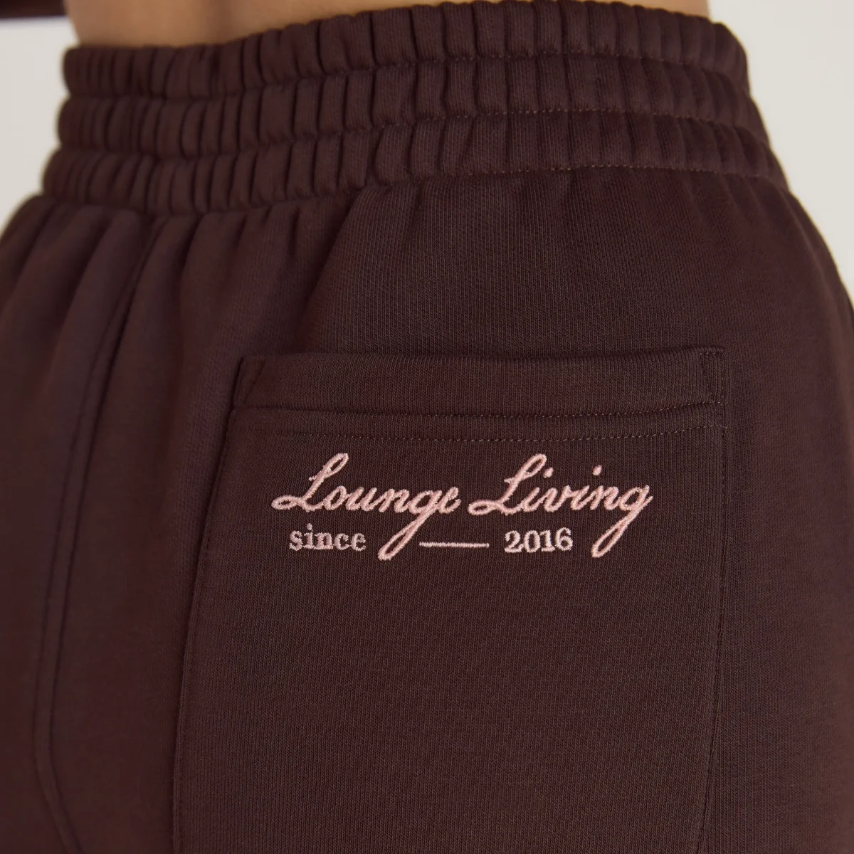 Tissu brossé Ceinture élastiquée et froncée Détails de couture sur les côtés Logo Lounge sur la hanche Logo imprimé sur la poche frontale Poche arrière