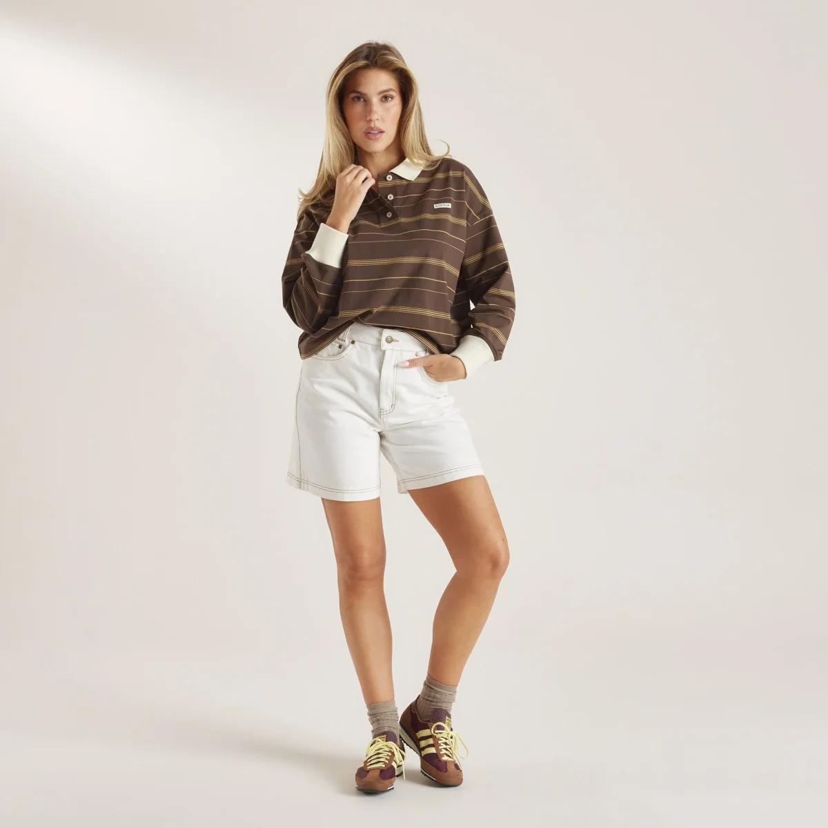 Short en denim longline Longueur mi-cuisse Coupe large Coutures contrastées tout au long Élément en or de style vintage Fermeture éclair au niveau de l’ouverture Fermeture à bouton à la taille Passants de ceinture Patch en cuir PU avec gravure du logo Poches arrière avec détails de couture Poches avant Rivets gravés du logo L