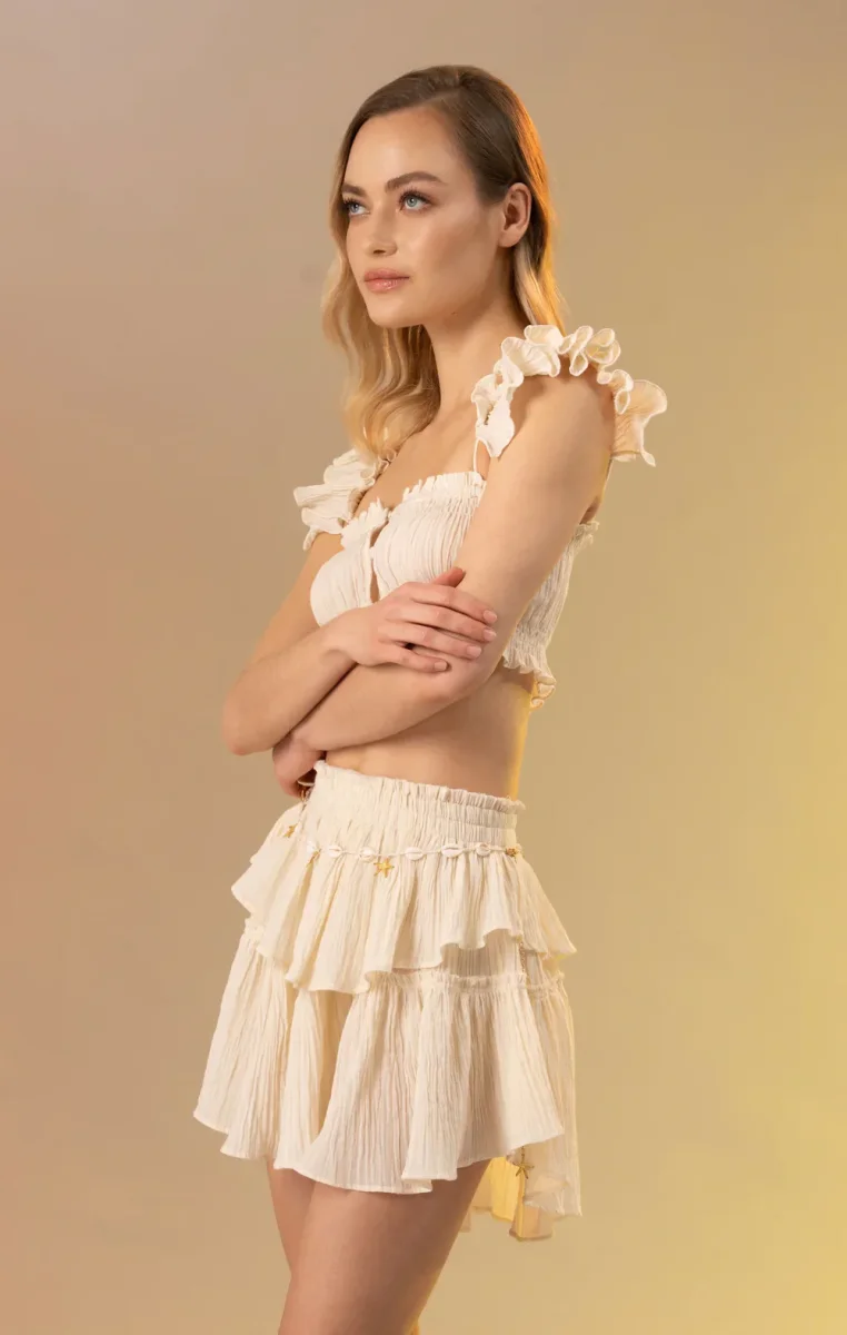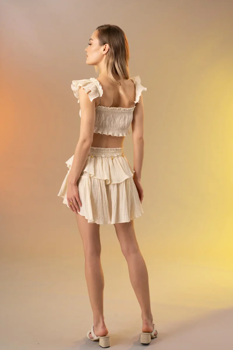 Son ourlet légèrement asymétrique crée une silhouette subtilement dynamique, tandis que sa coupe courte dévoile les jambes avec élégance.