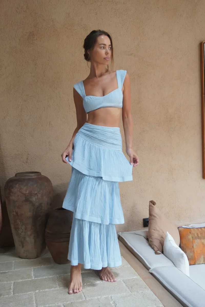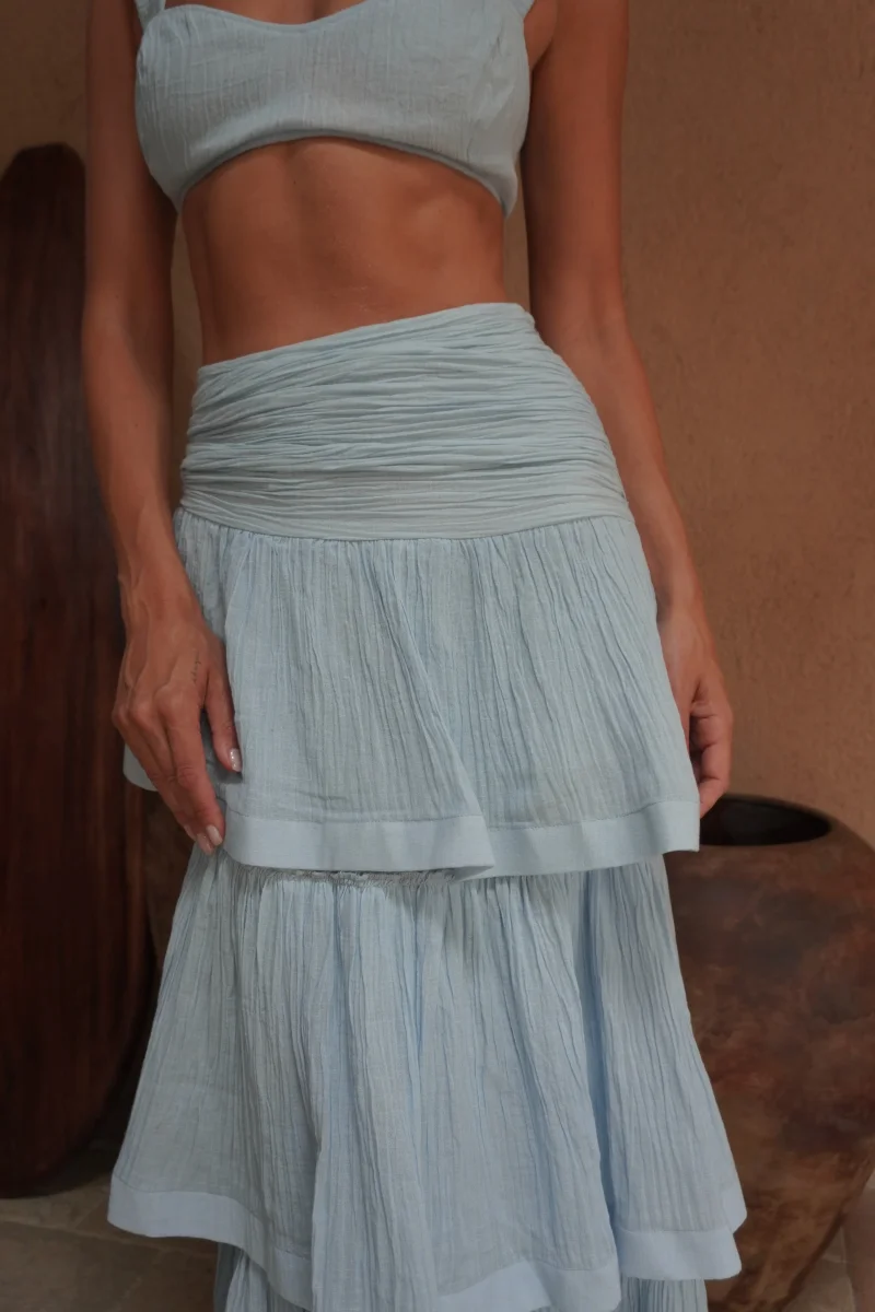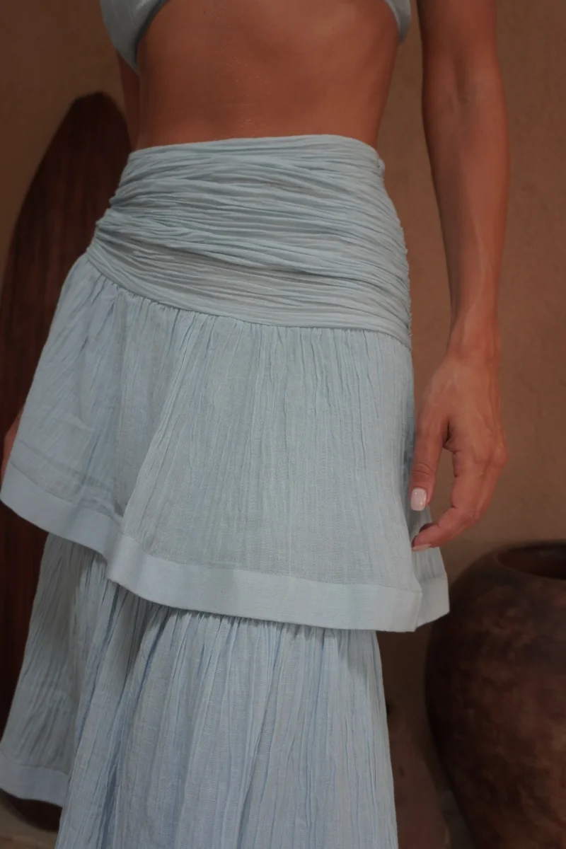 Confectionnée en gaze de coton légère et texturée, la jupe Fiona déploie trois volants fluides pour une silhouette romantique et aérienne. Sa taille haute froncée assure un maintien élégant tout en garantissant un confort absolu, tandis que les bords bruts lui confèrent ce charme artisanal si recherché.