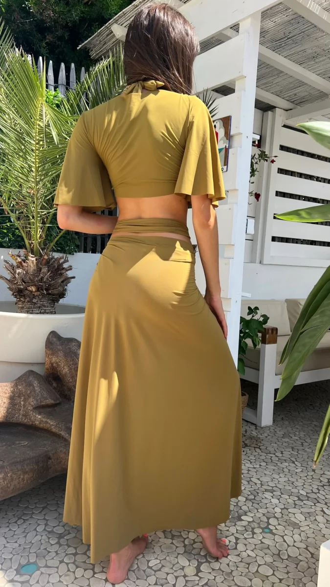 PETRA de la maison Pain de Sucre est une jupe paréo multi-positions qui se transforme au gré de vos envies estivales. En voile léger extensible, elle s’attache autour de la taille pour une version jupe fluide, se noue autour du cou ou en amazone pour devenir une robe de plage aérienne, ou se porte bustier en soulignant la féminité des épaules. Son grand anneau bijou doré de 6 cm apporte une touche précieuse, tandis que sa teinte noire intemporelle sublime toutes les silhouettes. Confectionnée en 74 % polyamide et 26 % élasthanne, elle allie élégance, confort et polyvalence. La mannequin studio mesure
