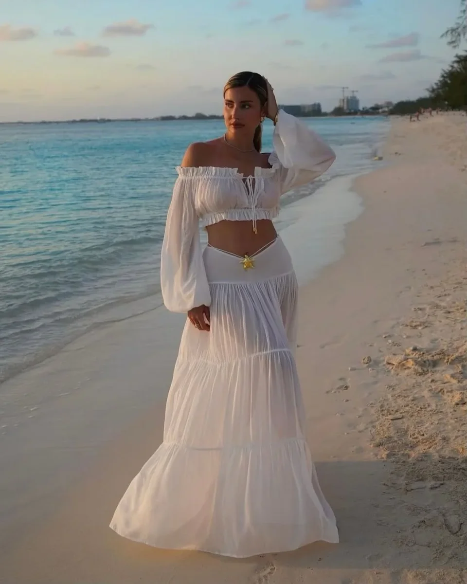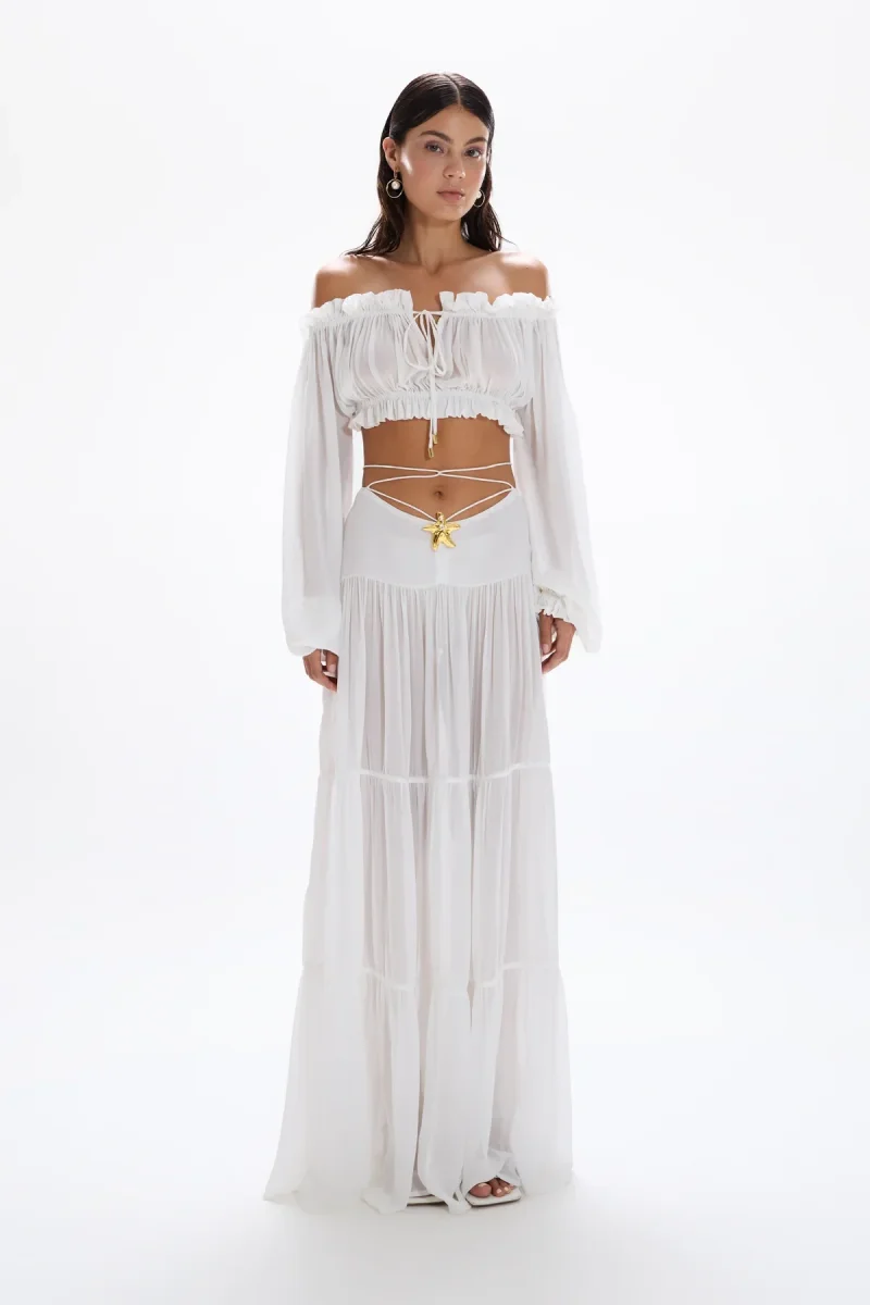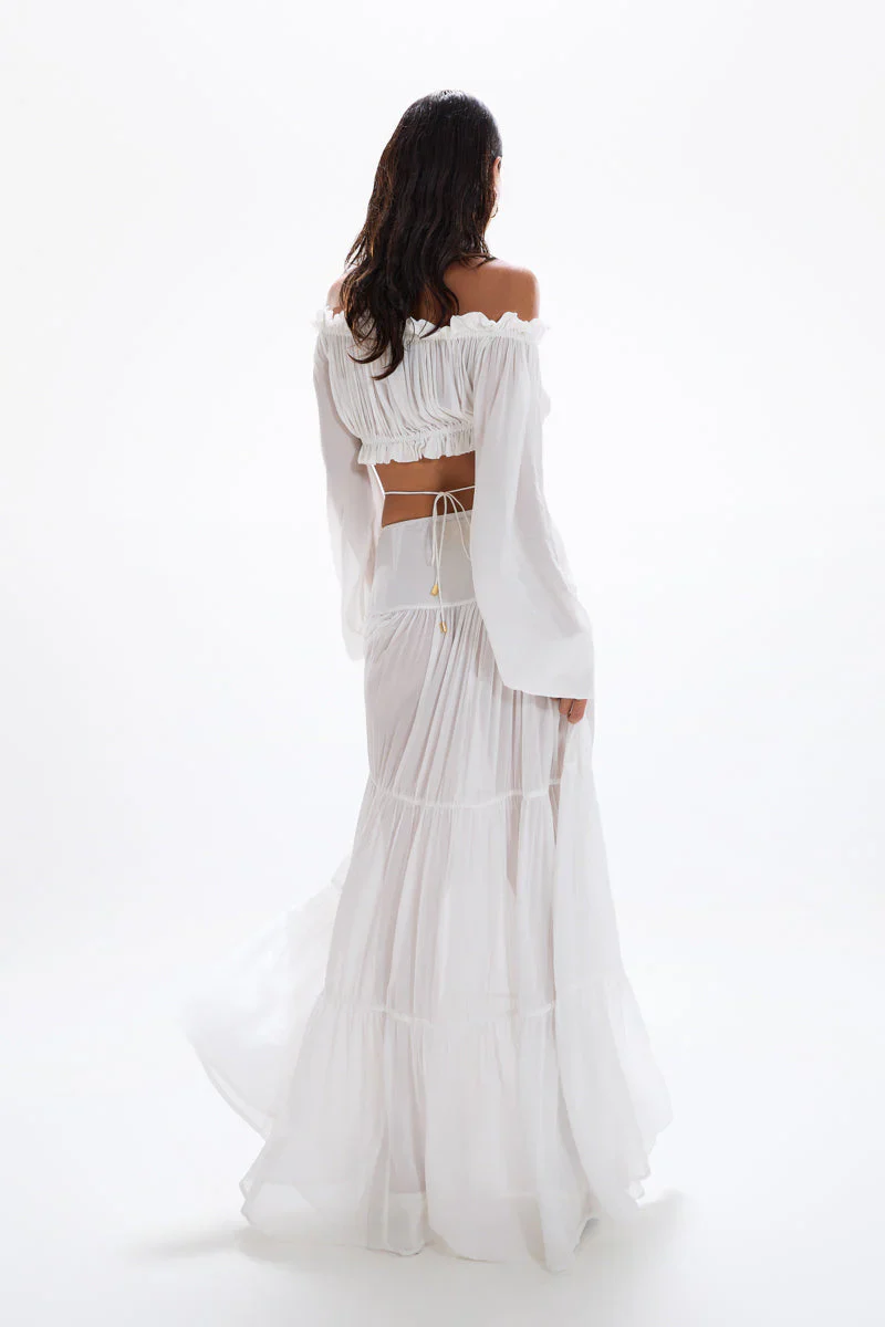 Inspirée du flamenco et teintée d’une sensualité estivale, la jupe Song révèle une silhouette dansante et solaire. Son volume subtilement structuré souligne chaque mouvement avec grâce.