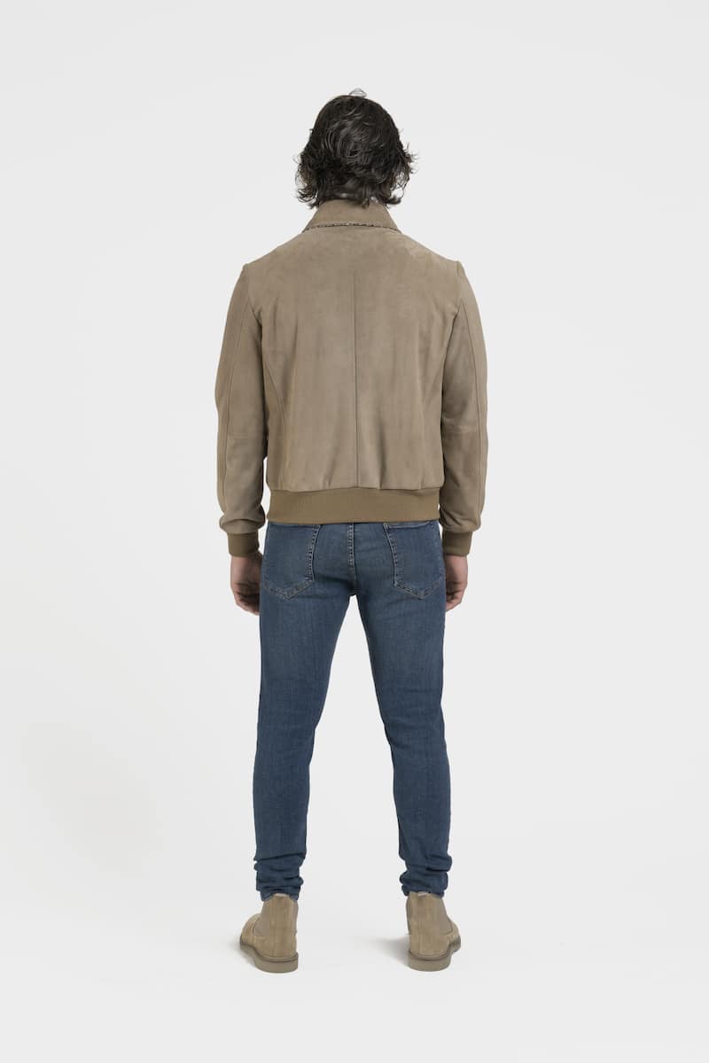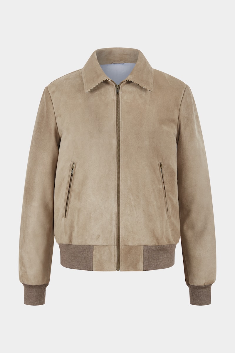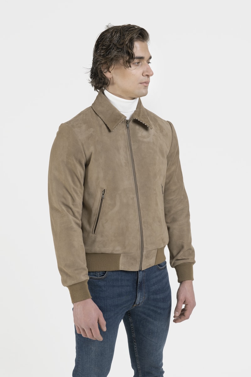 Ce blouson en daim agneau velours couleur beige présente un col revers à deux faces, deux poches latérales zippées, du tricot sur le bas des manches et une fermeture centrale éclair. L’intérieur en tissu chemise présente une finition soignée. Le modèle Legato au style à la fois sportif et élégant, est un blouson bombardier épuré et intemporel, indispensable de la garde-robe masculine.