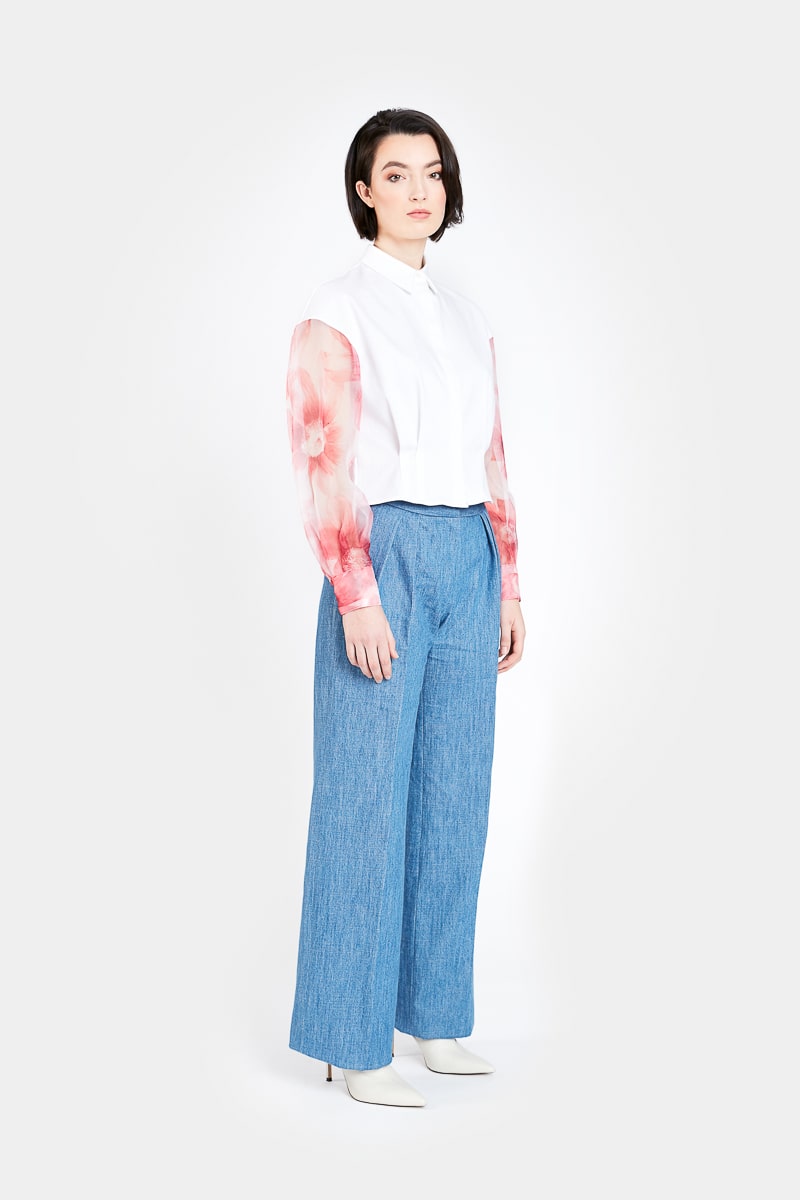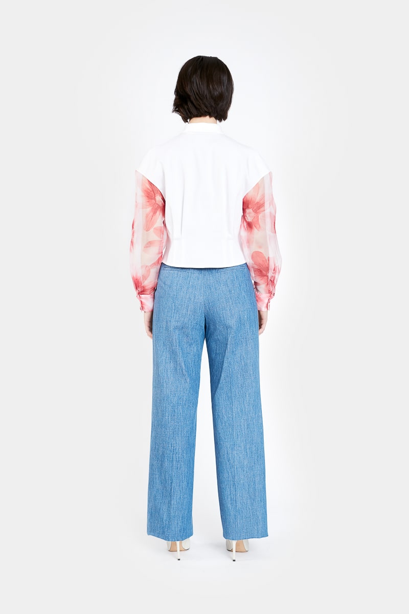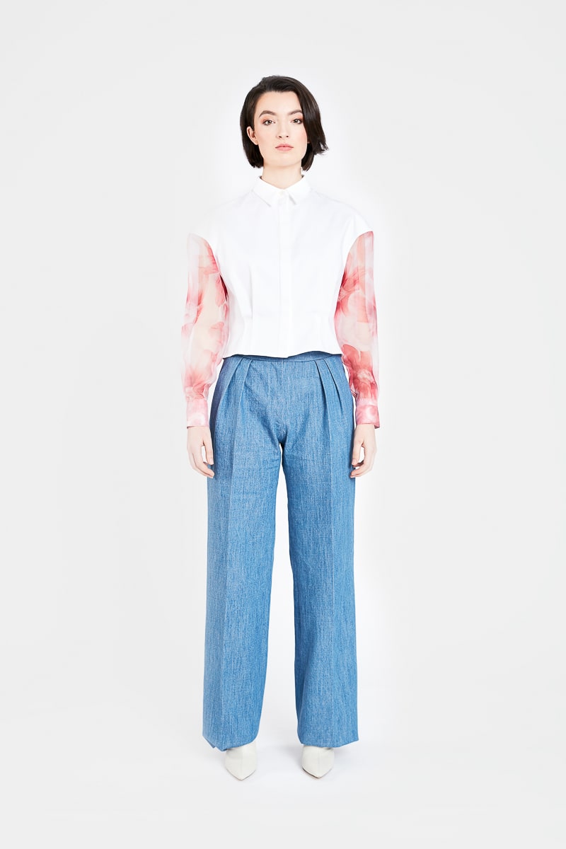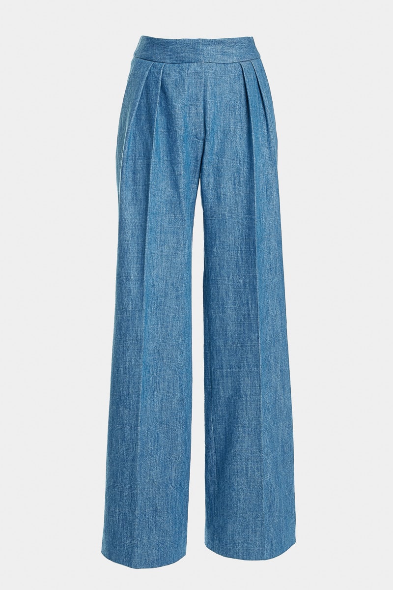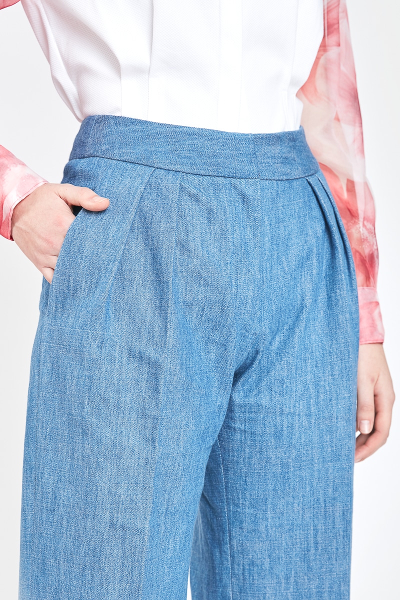 Ce pantalon taille haute en jean bleu clair présente une coupe droite ample, deux pinces sur le devant, deux poches latérales, et deux poches arrière. Loredana présente une coupe classique et moderne et s’associe à toutes vos tenues.