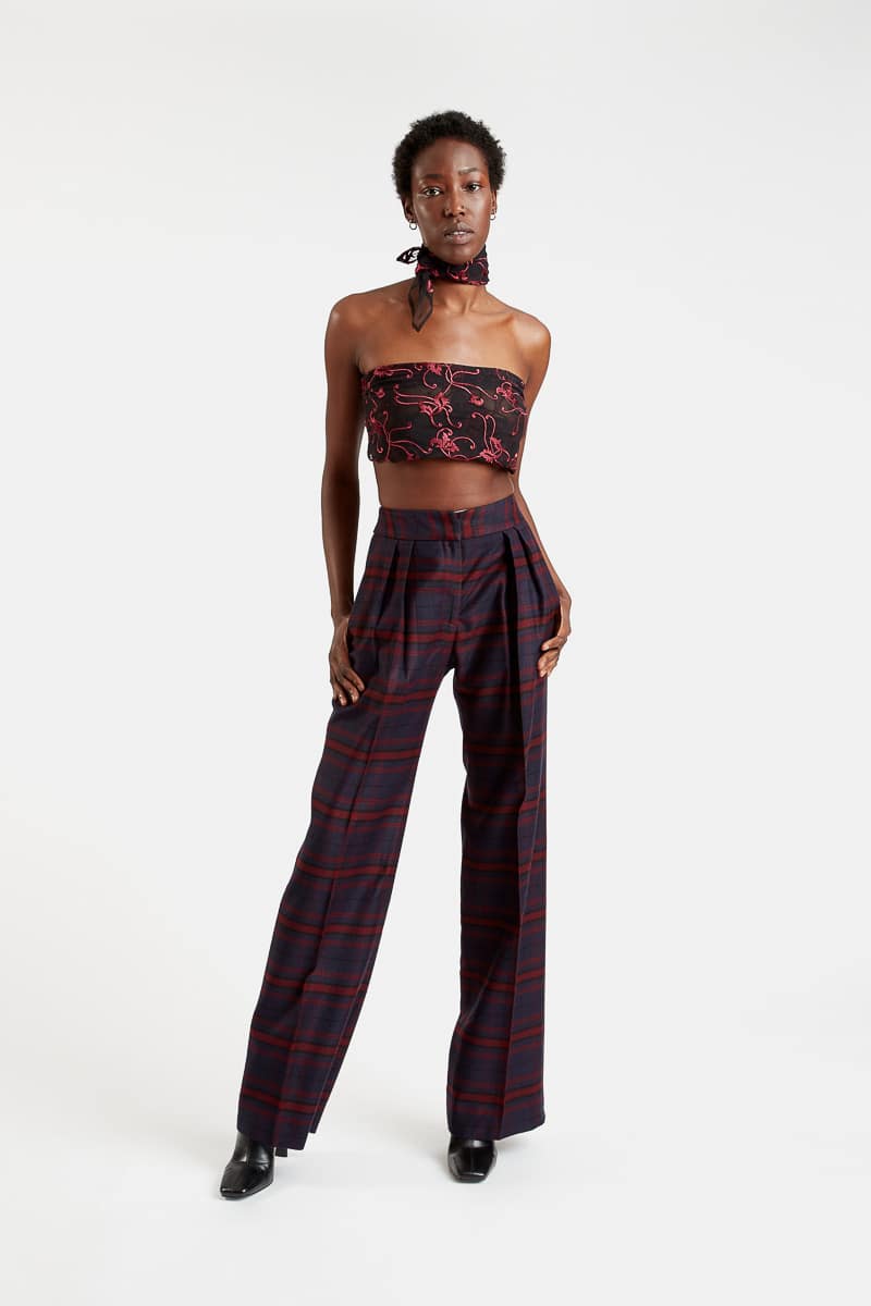 Ce pantalon taille haute en laine à carreaux bordeaux et bleu marine présente une coupe droite ample, deux pinces à l’avant, deux poches latérales obliques, et deux poches arrière. Confectionné dans un tissu léger mais chaud, le pantalon à carreaux Loredana est une pièce à la coupe classique qui s’associe à notre blazer Himalaya afin de créer un total look. Ses carreaux et ses couleurs peu communes en font une pièce tendance et originale.