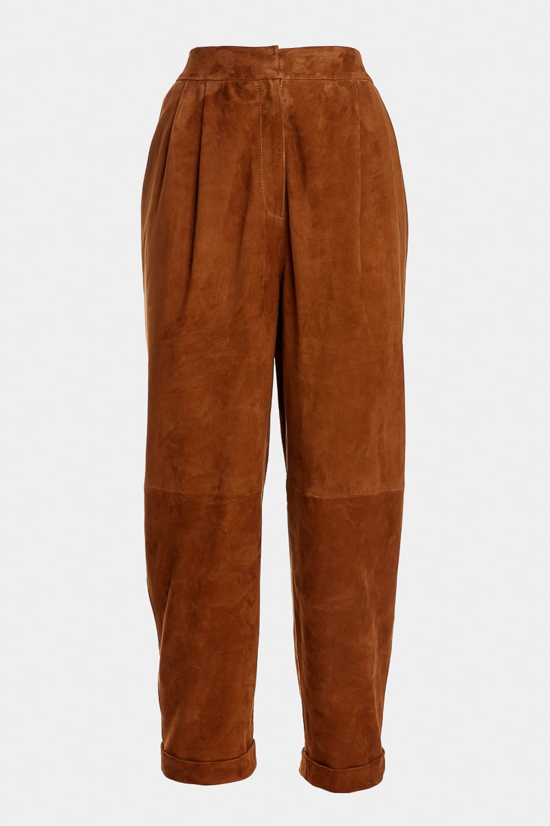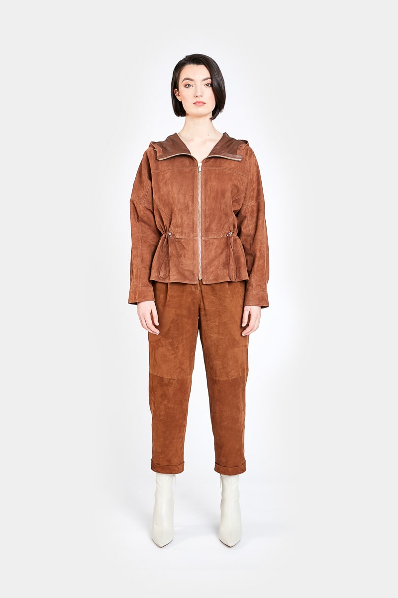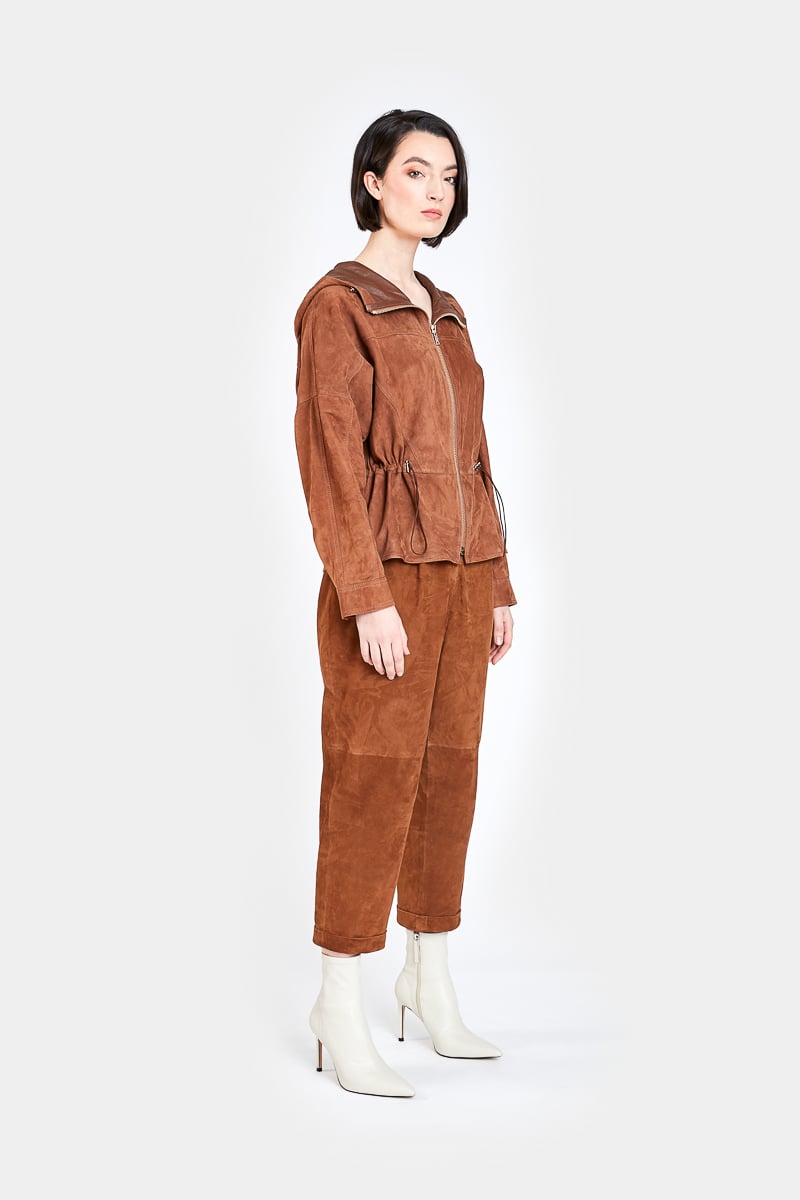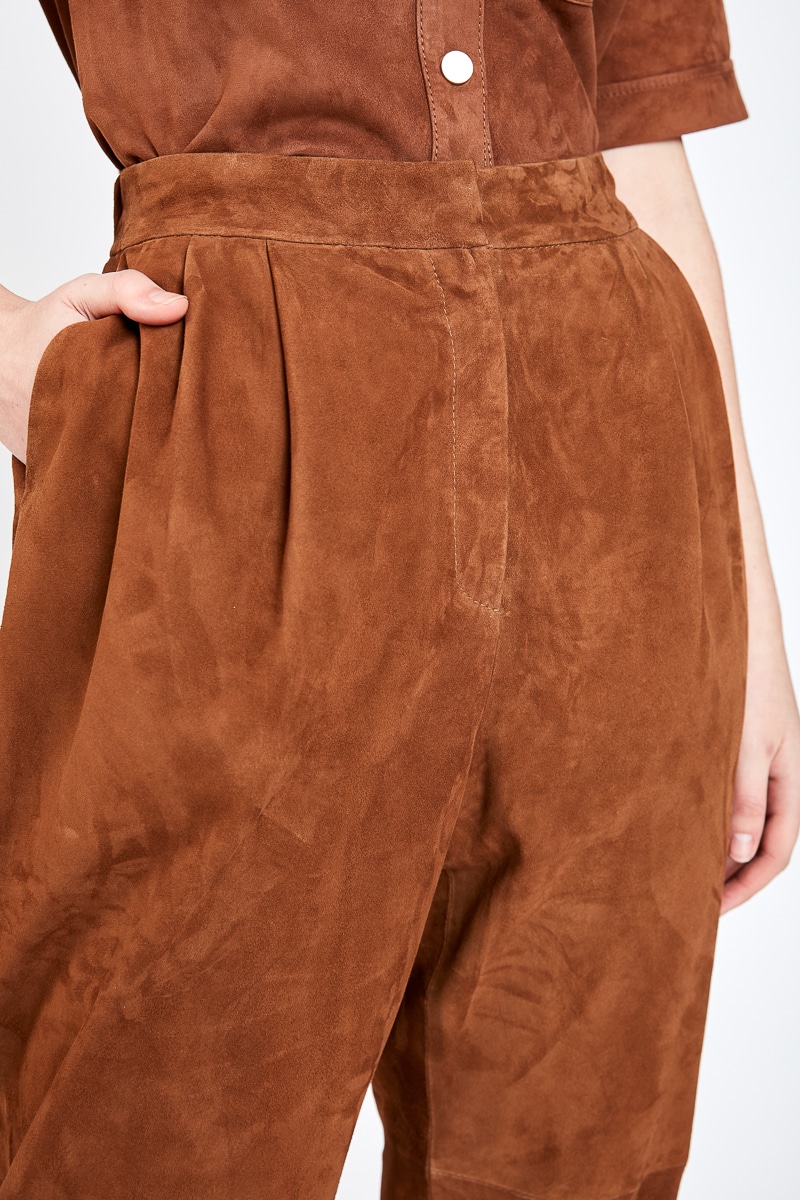 Ce pantalon ¾ coupe oversize et taille haute en daim chèvre velours couleur marron noisette présente deux poches latérales, une fermeture éclair centrale invisible, une ceinture élastique dans le dos et deux poches arrière. Louane présente deux doubles plis sur le devant permettant de créer du volume et donner du confort. Une des pièces phares de nos collections cuir, le pantalon Louane est un intemporel de la garde-robe féminine.