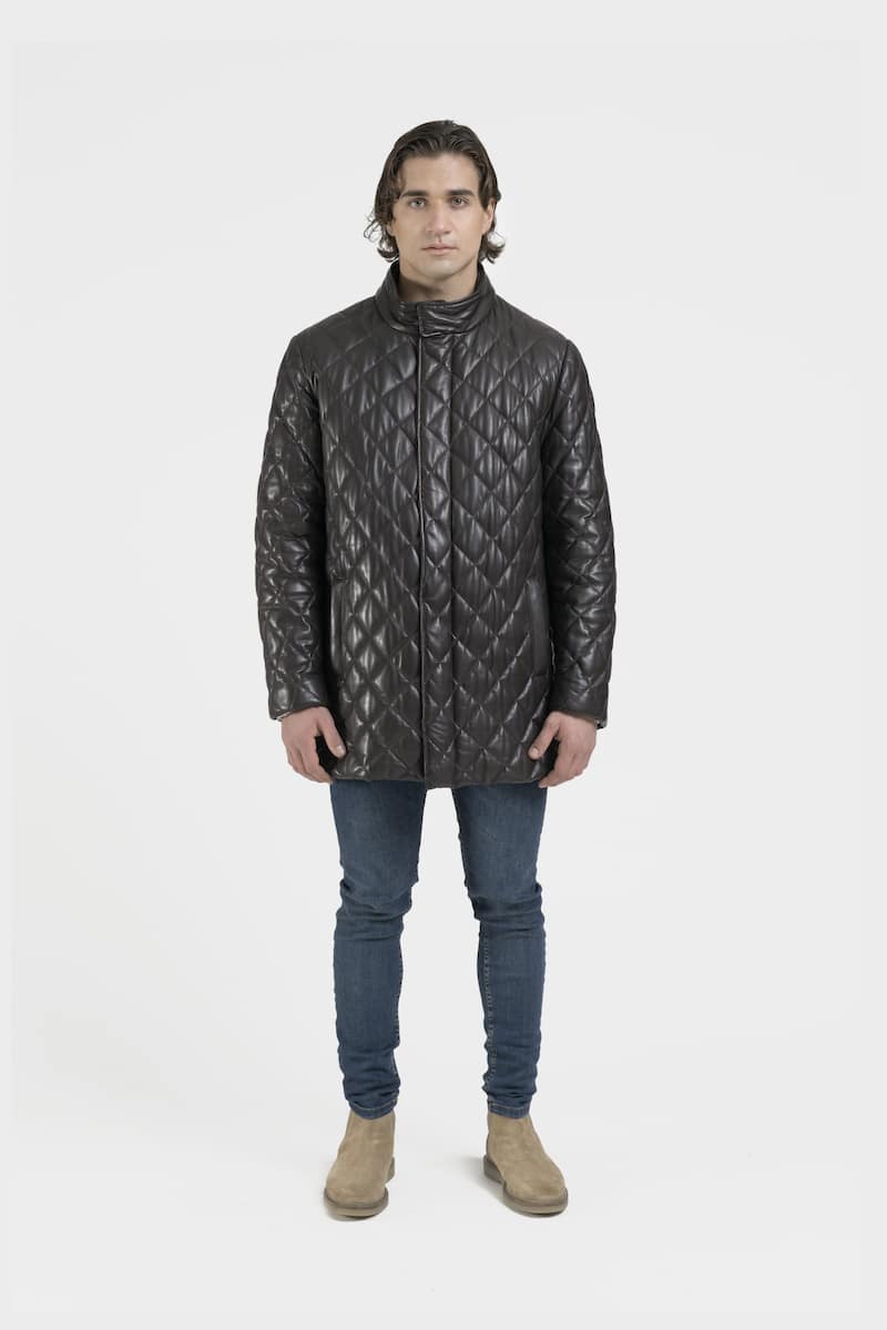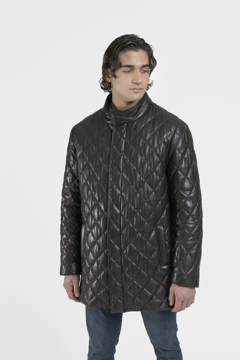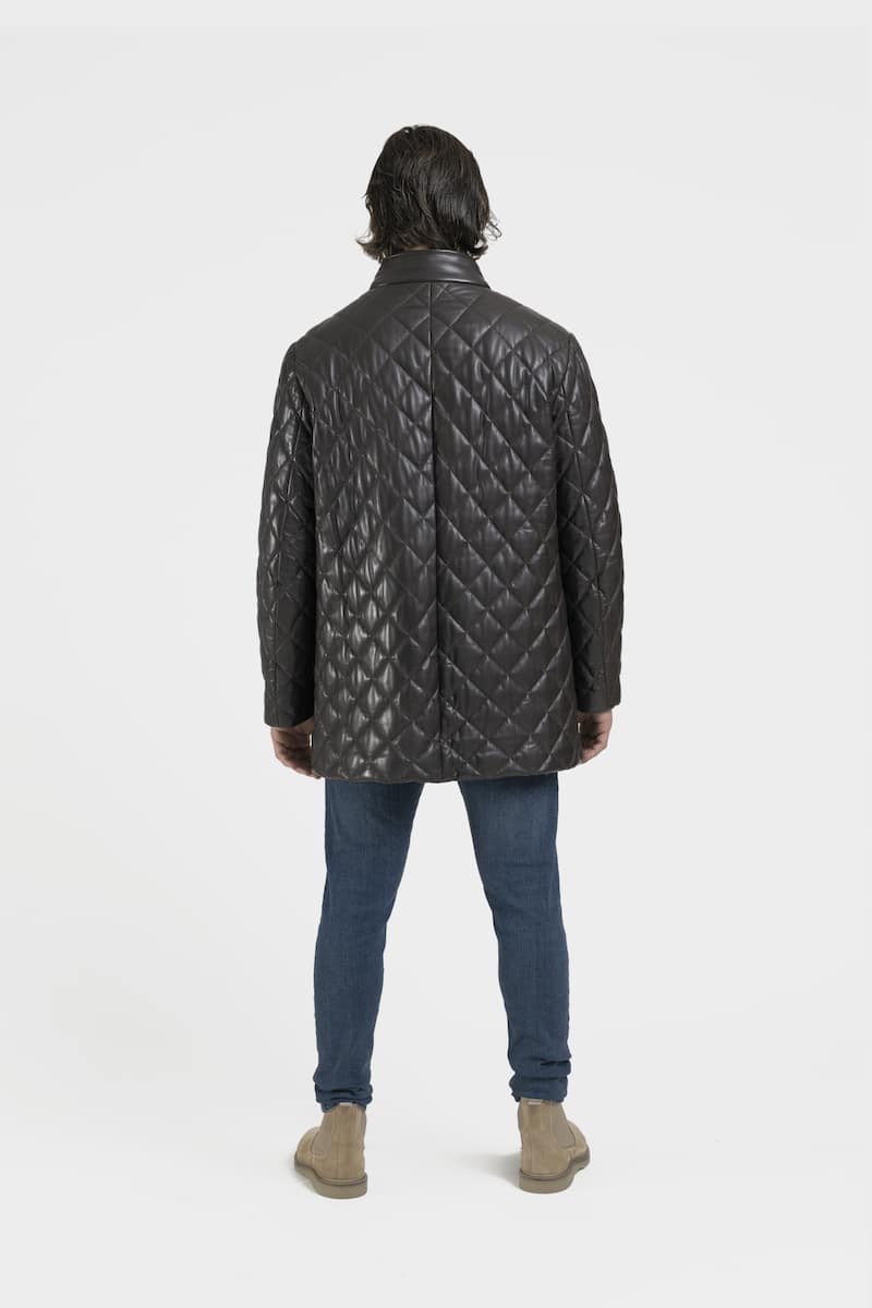 Ce long manteau capitonné col officier en cuir d’agneau marron, présente une fermeture centrale à boutons cousus main, deux poches passepoilées latérales double entrée, deux poches intérieures et une fente d’aisance milieu dos. Le modèle Lucio propose un style élégant et sophistiqué, manteau technique indispensable d’une garde-robe mode.