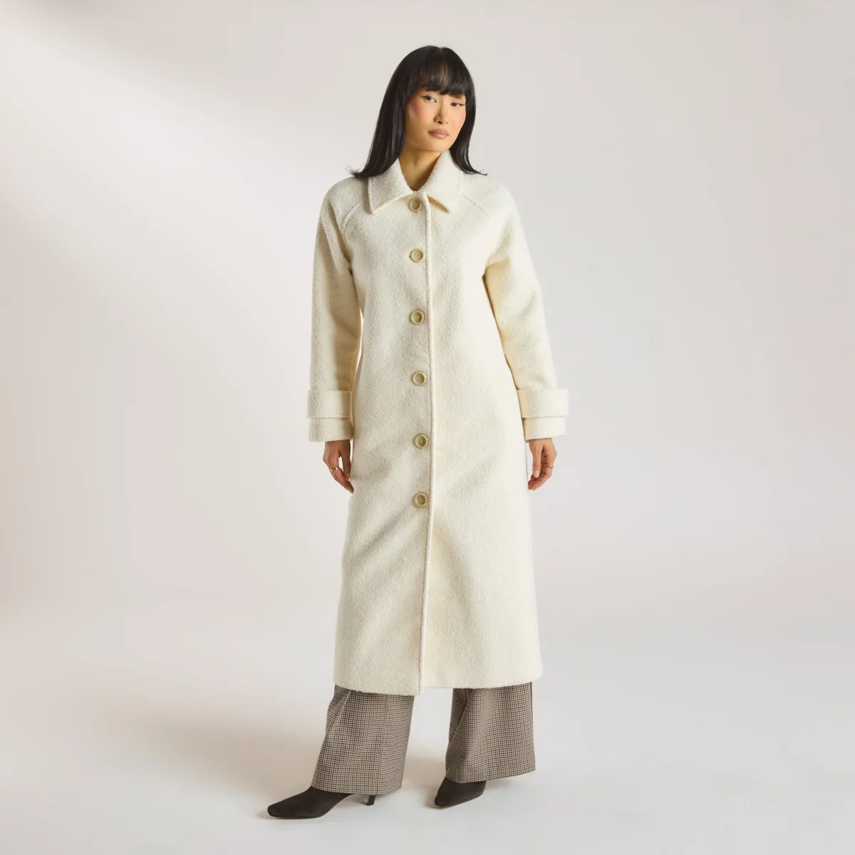 Manteau long en shearling style raglan Détails de col Fermeture boutonnée sur toute la longueur 2 poches doublées à l’avant Manchettes avec passants et fermeture par bouton Doublure intérieure douce Fente au dos Boutons en corne crème avec logo gravé