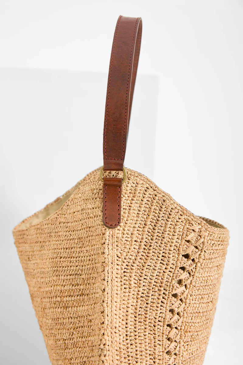 Matières : 100% en Raphia naturel, ce sac doublé en coton bio allie souplesse et solidité d’une matière naturelle et durable. L’anse est en cuir de zébu tanné selon un procédé végétal.
