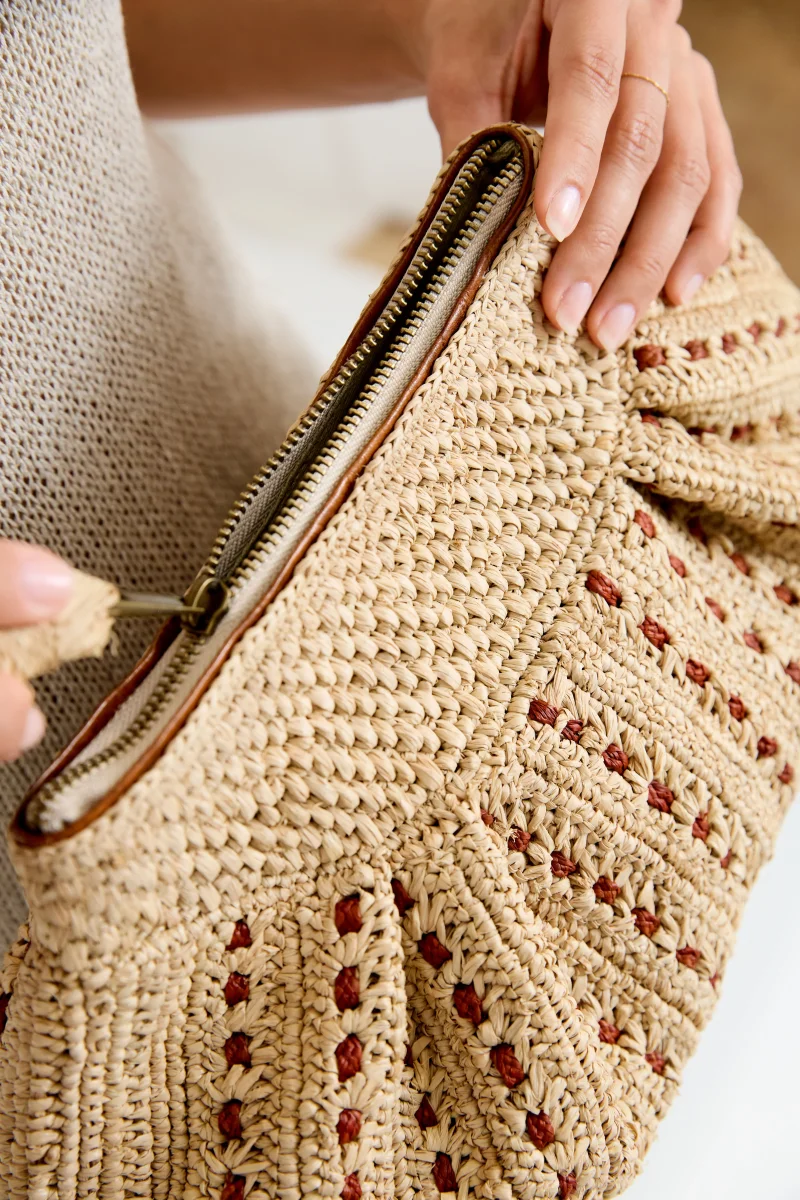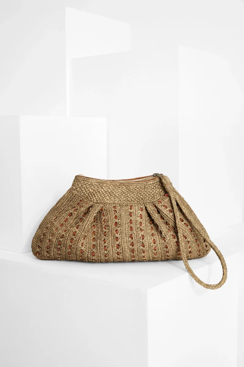 Découvrez MEZZO, une pochette en raphia au style raffiné qui apporte une touche de chic naturel à toutes vos tenues.
