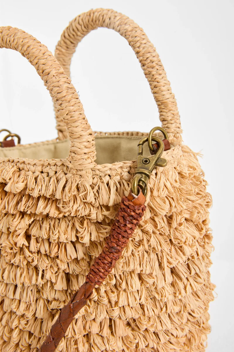 Caractéristiques : Un rabat intérieur à coulisses en coton bio permet de cacher le contenu du sac et de le fermer avec un lien. Lanière amovible en cuir et anses en raphia.