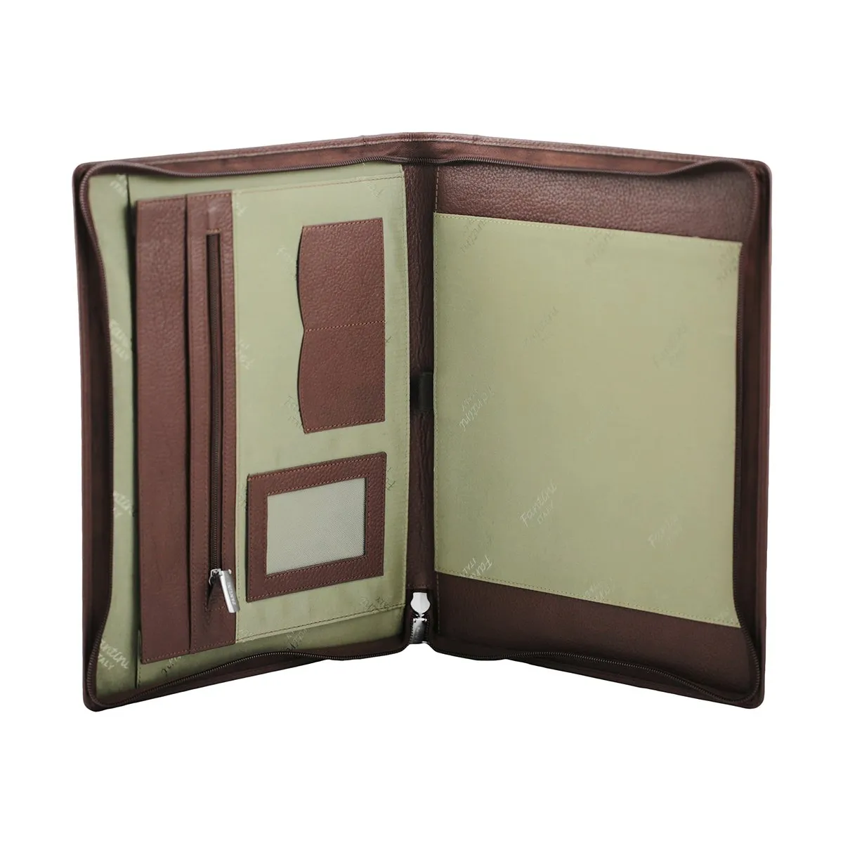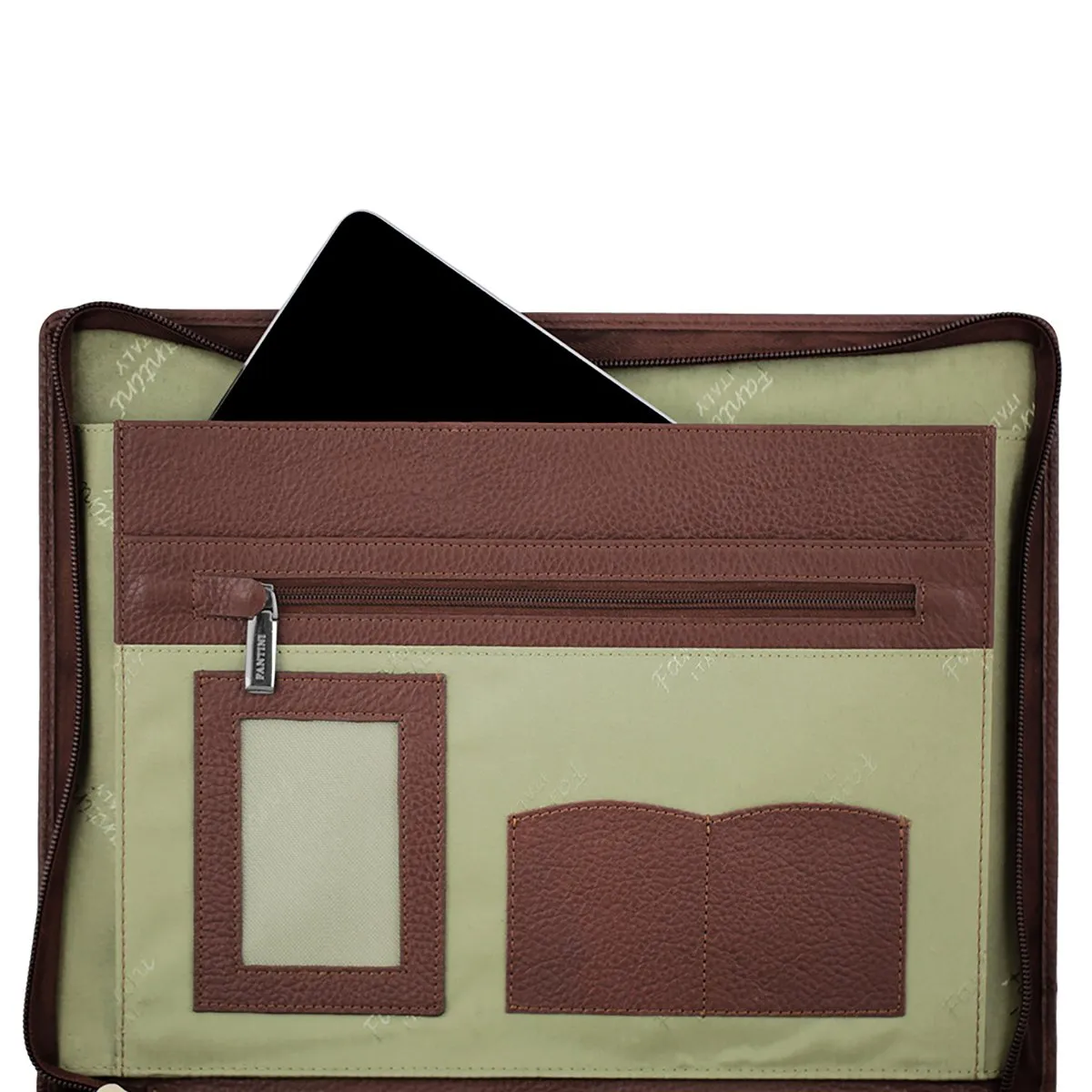 Le porte-documents est un accessoire prisé par les professionnels travaillant dans des bureaux, des établissements scolaires, etc. Cet article, modèle Toronto, se distingue par son cuir robuste et rigide, travaillé pour obtenir l’authentique aspect martelé. Cette pièce en cuir brun dispose d’une fermeture latérale à zip et d’un petit triangle argenté gravé portant le logo de notre maroquinerie. L’intérieur spacieux est doublé de coton avec une impression Fantini. Il comprend une poche conçue pour un bloc A4 ainsi que plusieurs compartiments supplémentaires : trois poches destinées aux cartes de crédit et documents, plus une autre avec fermeture éclair. Ce porte-documents en cuir tête de moro convient parfaitement à ceux qui souhaitent garder toujours à portée de main un accessoire pratique pour ranger documents, contrats, tablettes et bien plus encore… tout en ne renonçant pas au raffinement du véritable cuir.