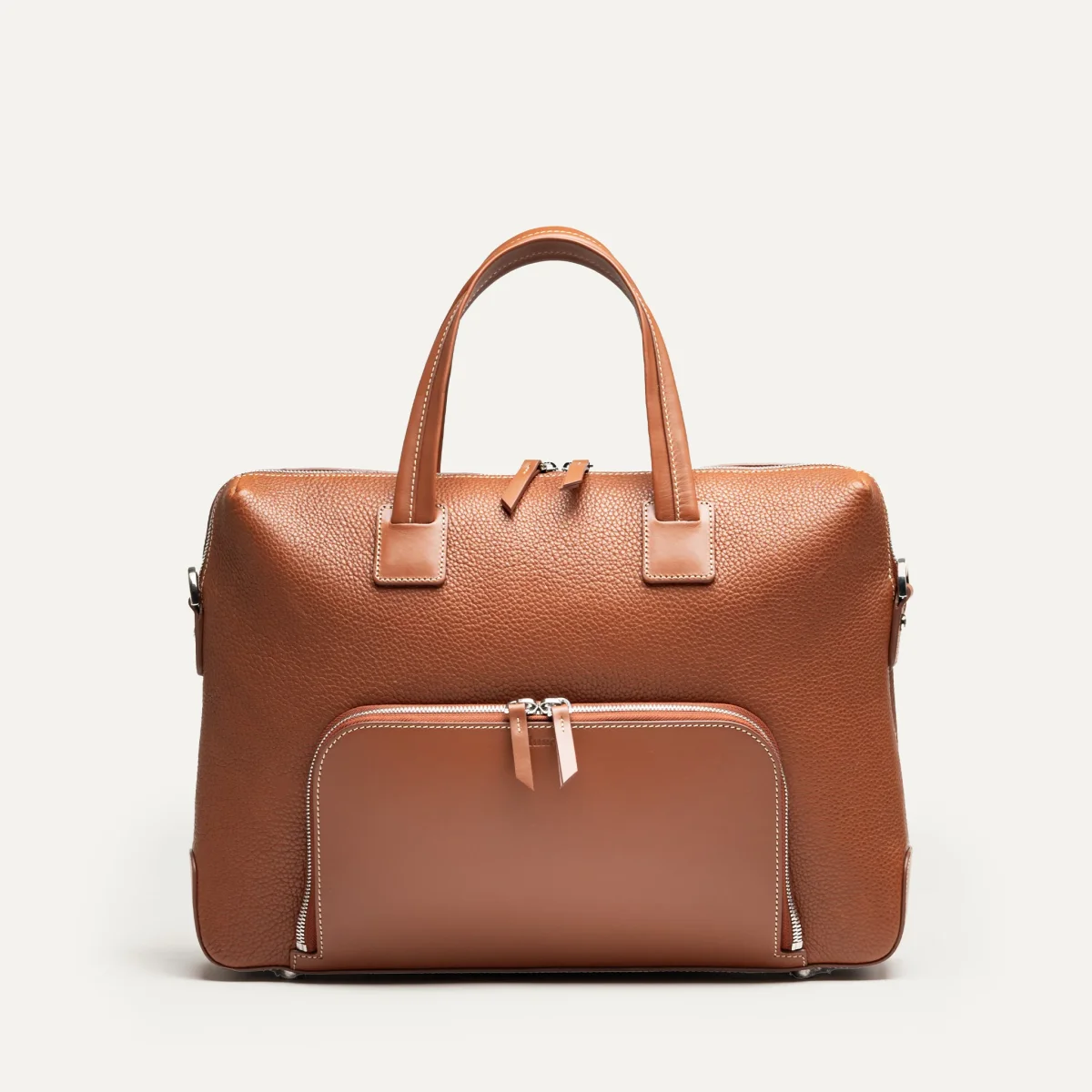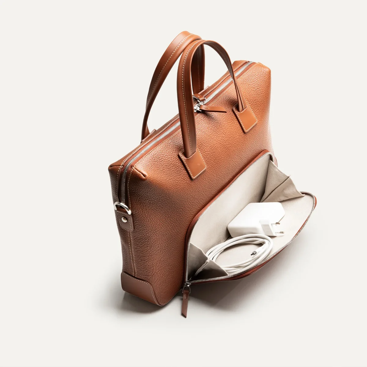 Ce porte-documents cognac pourrait bien devenir l’allié indispensable de vos journées. Ses dimensions compactes lui confèrent une silhouette élégante, facile à porter en toute circonstance.